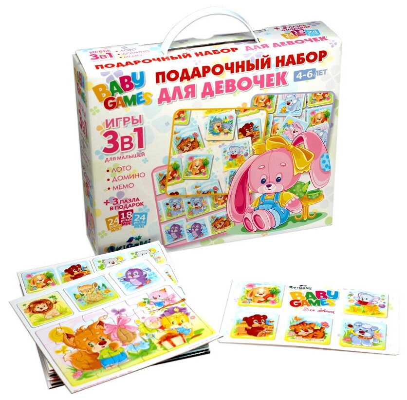 Подарочный набор 3в1 «Для девочек» — это уникальный набор, включающий в себя ряд развивающих настольных игр, благодаря которым ребенок узнает, что такое лото и домино, потренирует внимательность и память.