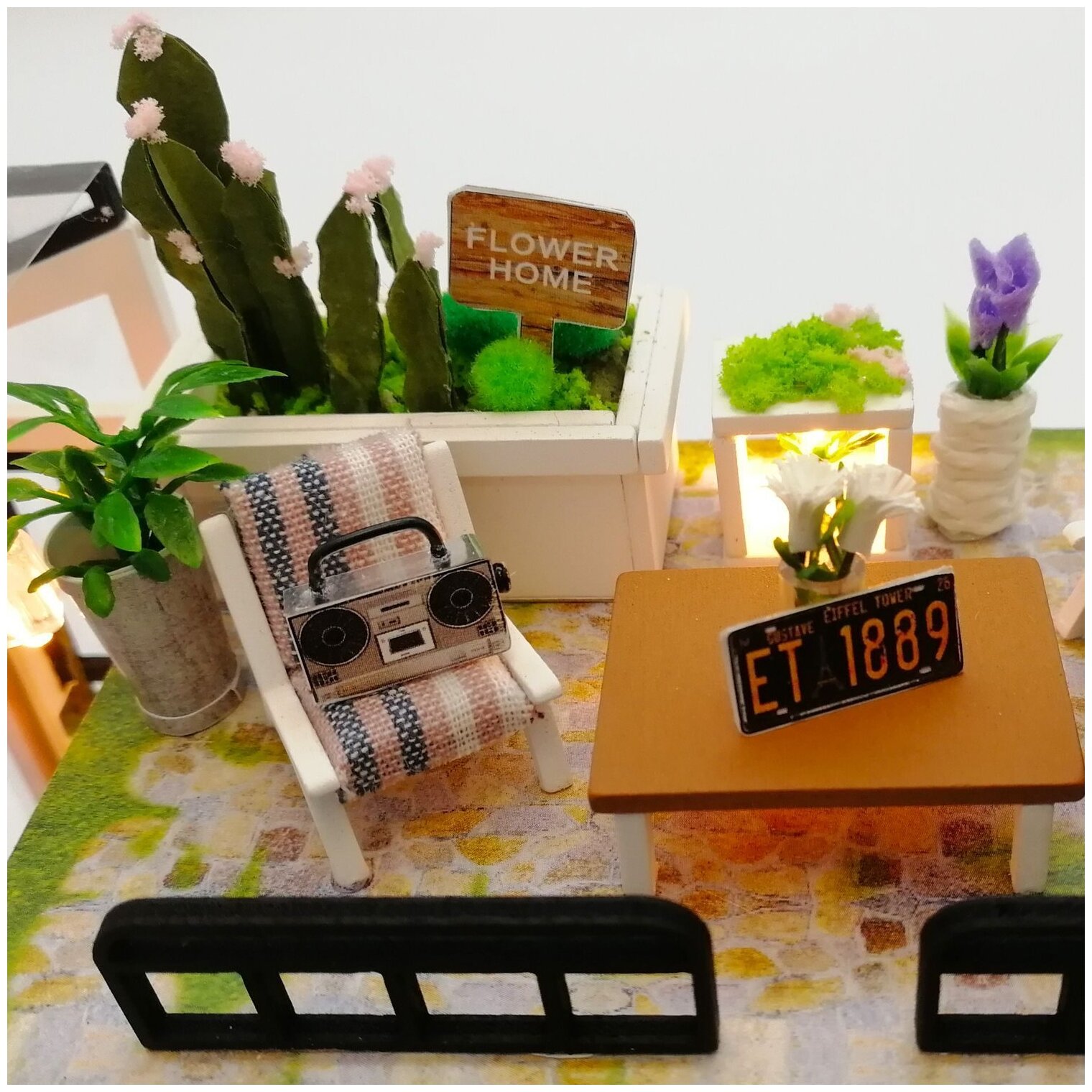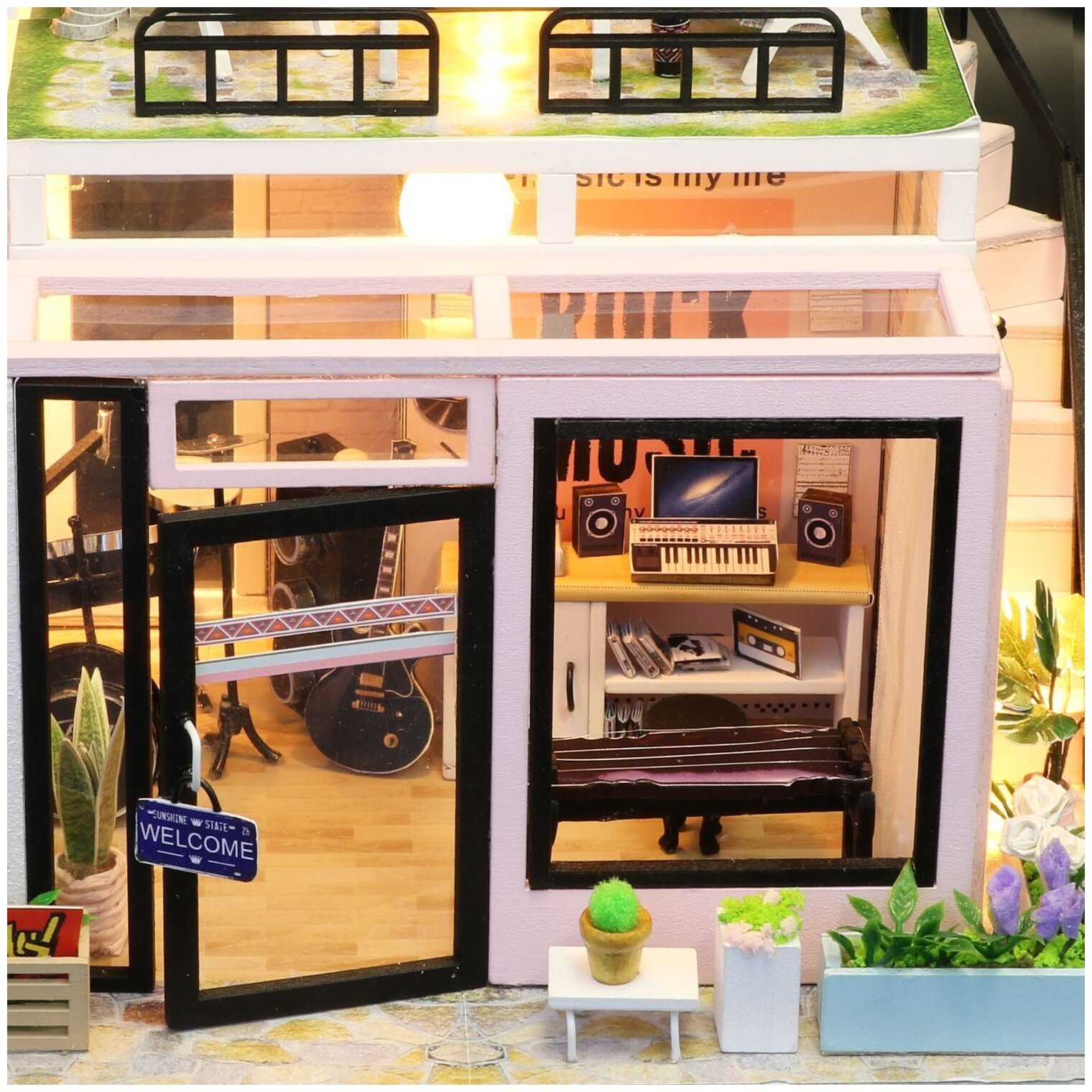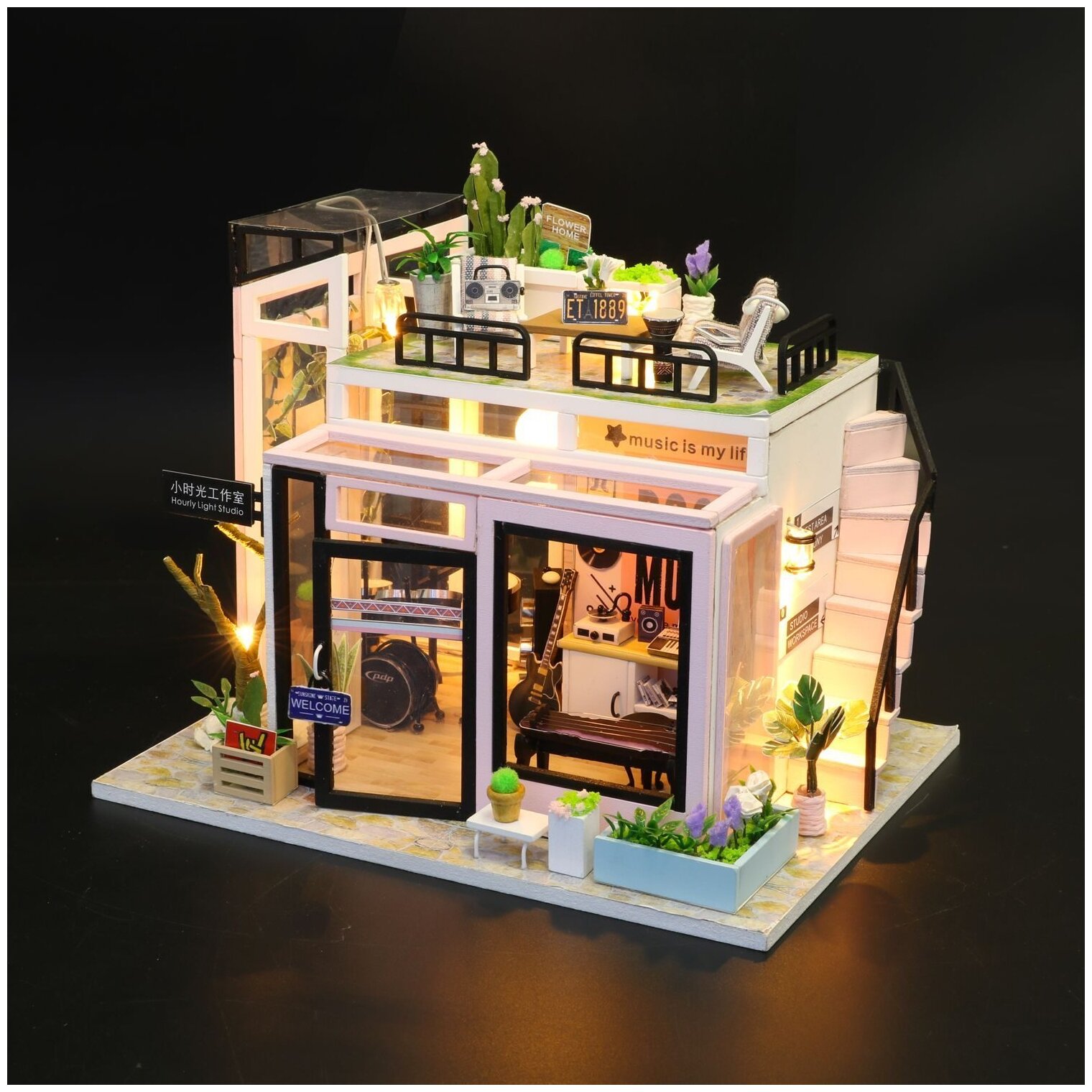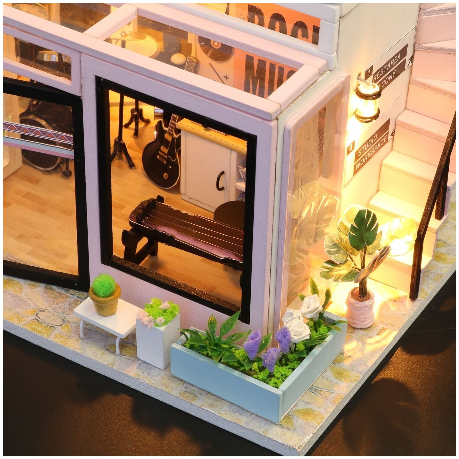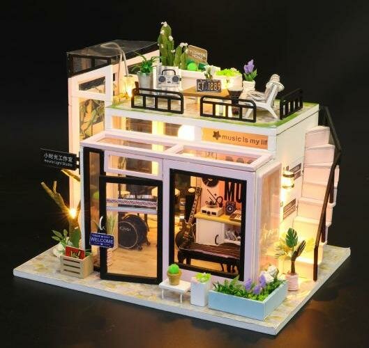 Интерьерный конструктор DIY Mini House Студия звукозаписи это небольшой домик, посвященный всем любителям музыки! Музыкальные инструменты, посвященные музыке аксессуары, множество продуманных мелких деталей и подсветка - все это вы найдете именно здесь. А открытая крыша со столиком, креслами и множеством зелени не оставят равнодушным и подарят заряд вдохновения как взрослому, так и ребенку!