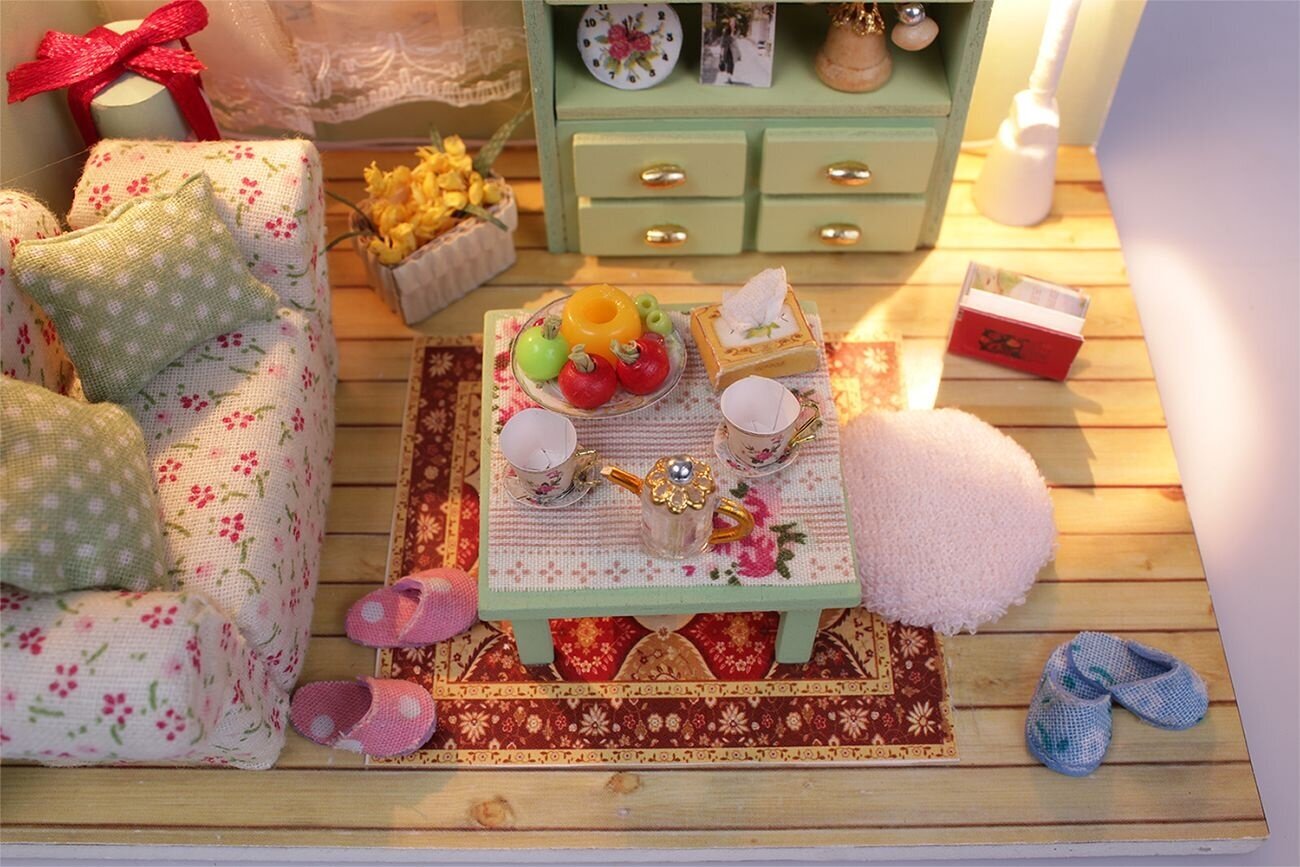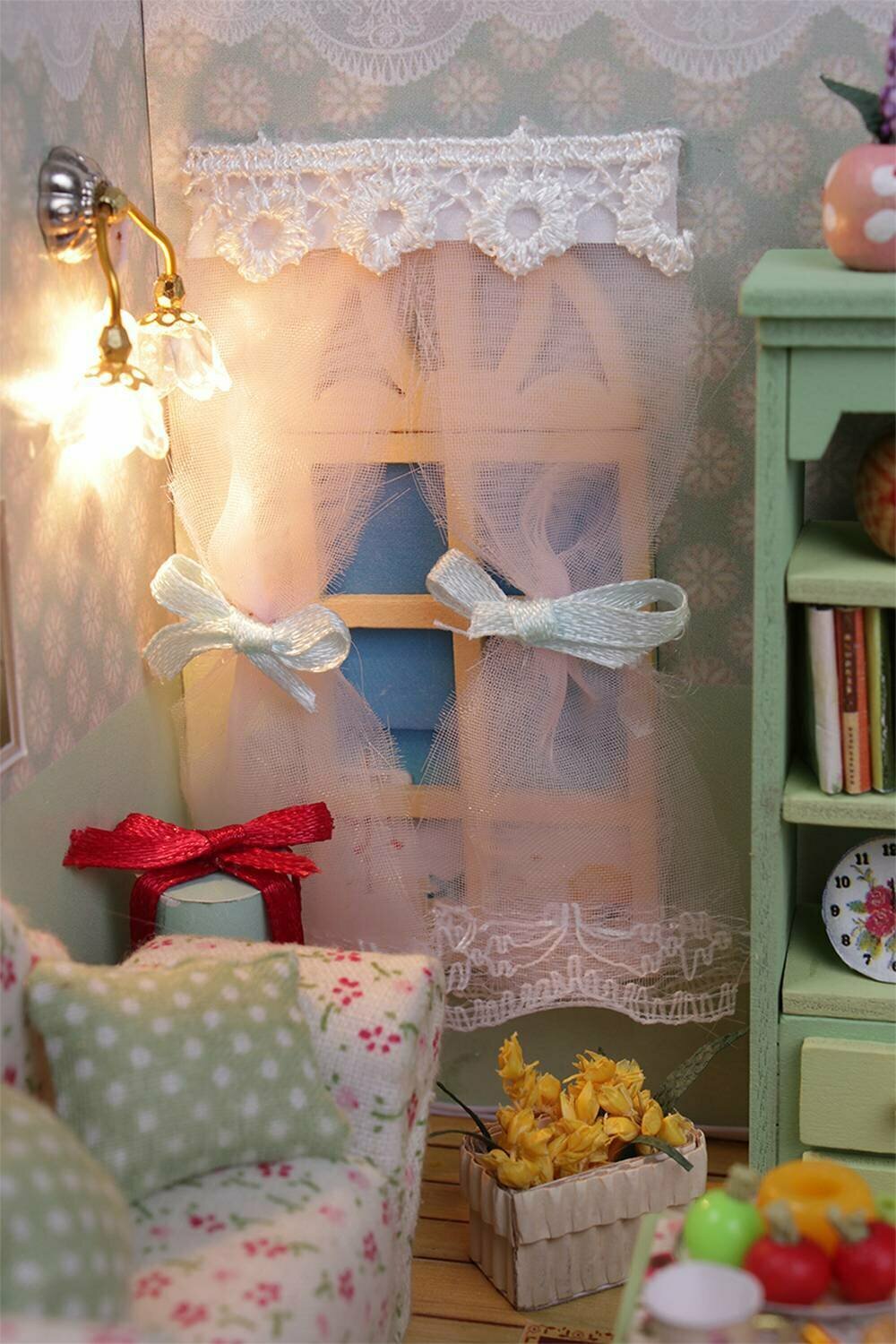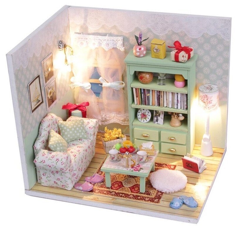 Румбокс Diy House "Чай вдвоём" - конструктор миниатюрной комнаты с интерьером, продуманным до мельчайших подробностей. Удобный диван с цветочным принтом, стильный шкаф мятного цвета с книгами и декором, мягкий нежно-розовый пуфик, аккуратный столик с чаем фруктами делают комнату невероятно милой, нежной и уютной.