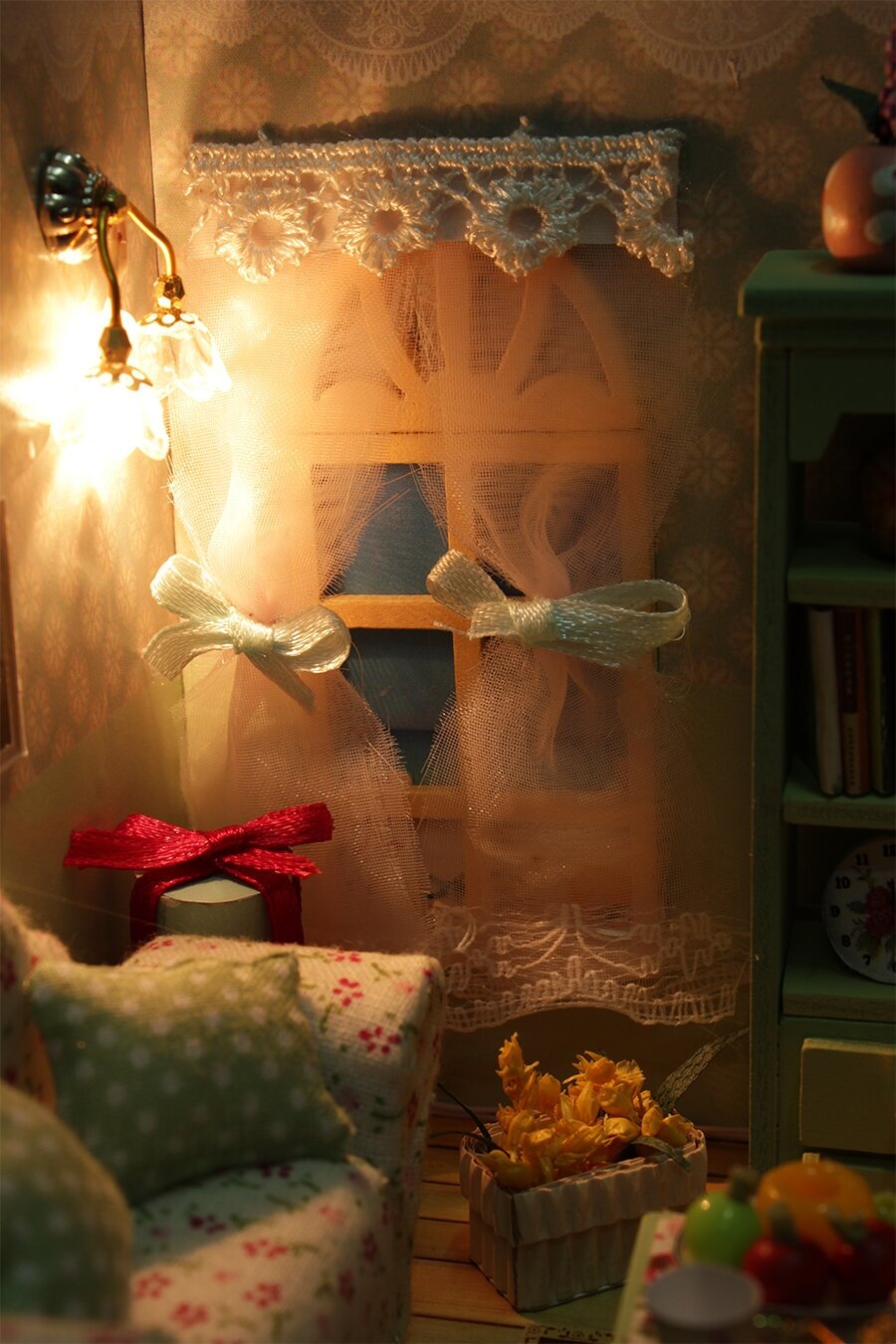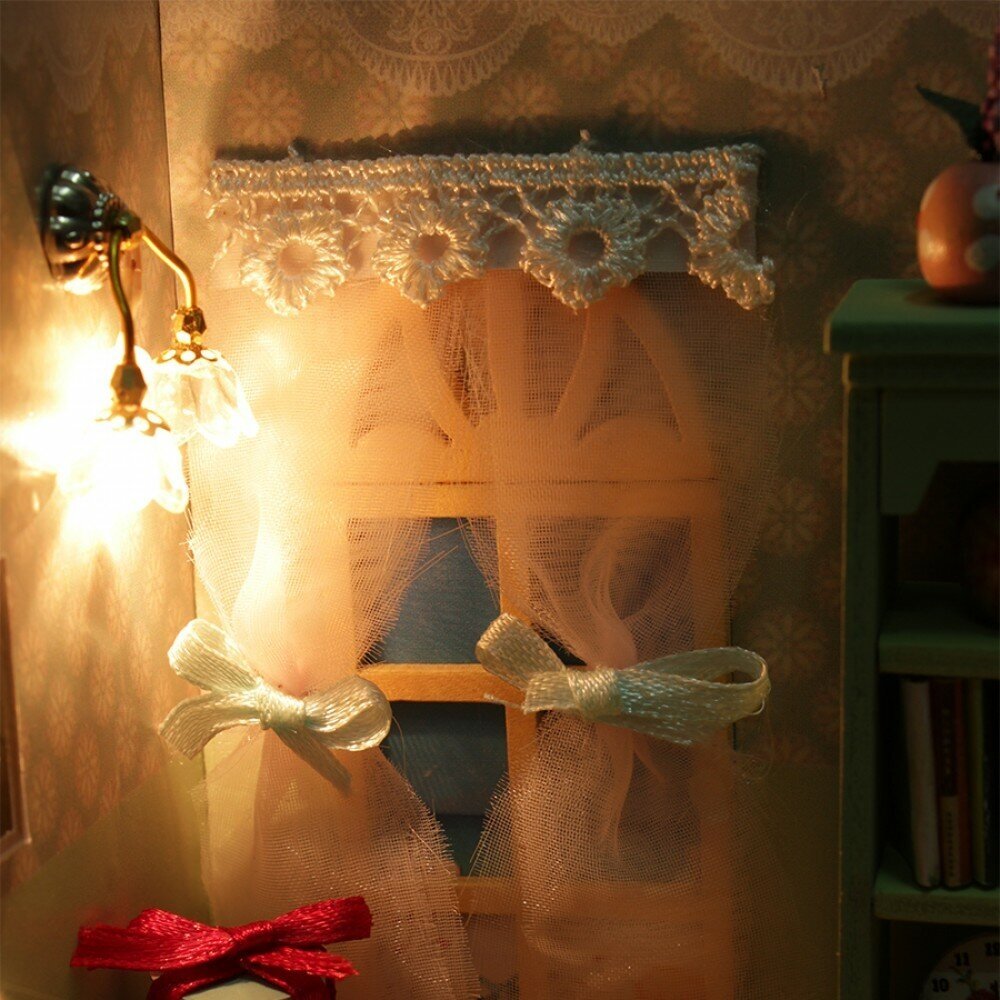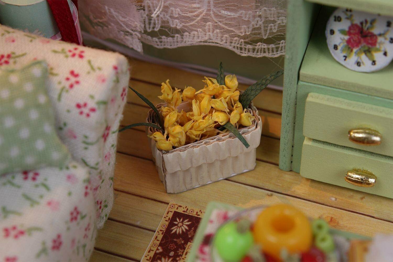 Румбокс Diy House "Чай вдвоём" - конструктор миниатюрной комнаты с интерьером, продуманным до мельчайших подробностей. Удобный диван с цветочным принтом, стильный шкаф мятного цвета с книгами и декором, мягкий нежно-розовый пуфик, аккуратный столик с чаем фруктами делают комнату невероятно милой, нежной и уютной.