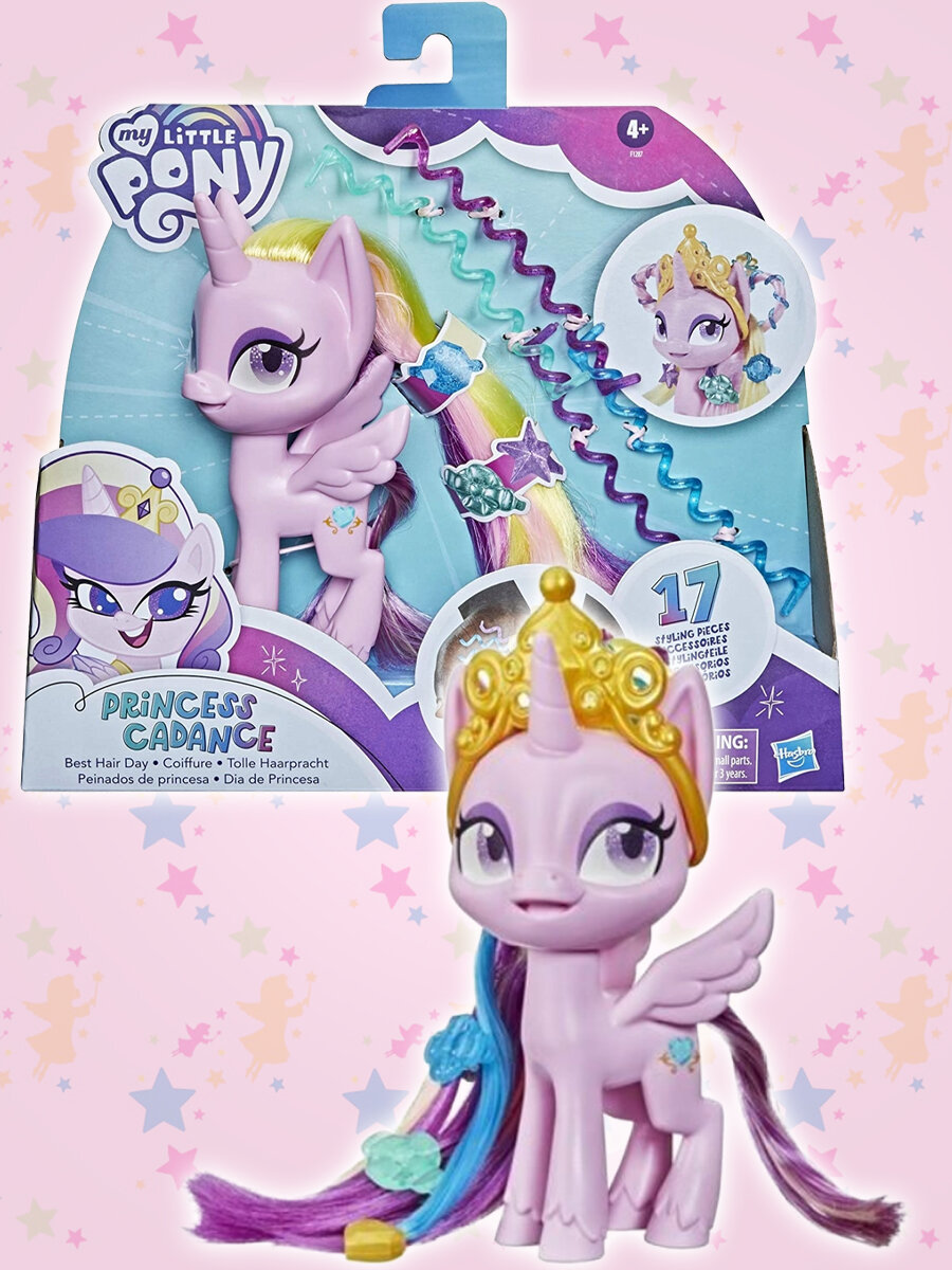 Принцесса Каденс готова полностью посвятить себя уходу за волосами! У очаровательной куклы высотой около 12,5 см волосы длиннее, чем обычно. Они просто созданы для безграничного веселья, укладки и стайлинга! В набор входят 17 аксессуаров, с которыми можно создать огромное количество причесок, а поможет вам в этом инструкция. Расчешите роскошные пряди, дополните их накладными локонами, уложите в высокую прическу и украсьте на свой вкус - королевской тиарой или очаровательными заколками. Станьте самым модным стилистом в Кристальной Империи!
