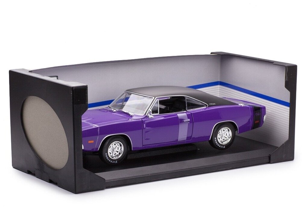 Машинка металлическая Маисто (Maisto) 1:18 SP (B) - 1969 Dodge Charger R/T 31387. Модель сделана с вниманием к исполнению мельчайших деталей. Корпус металлический, сделан методом литья под давлением. Машина имеет пластиковые элементы, которые придают ей еще большую схожесть с оригиналом. У модели открываются двери, вращается руль, вращаются и поворачиваются резиновые колеса, открывается капот, открывается багажник. Машина окрашена специальной автомобильной краской. Рамеры машинки: 29х8х11 см.