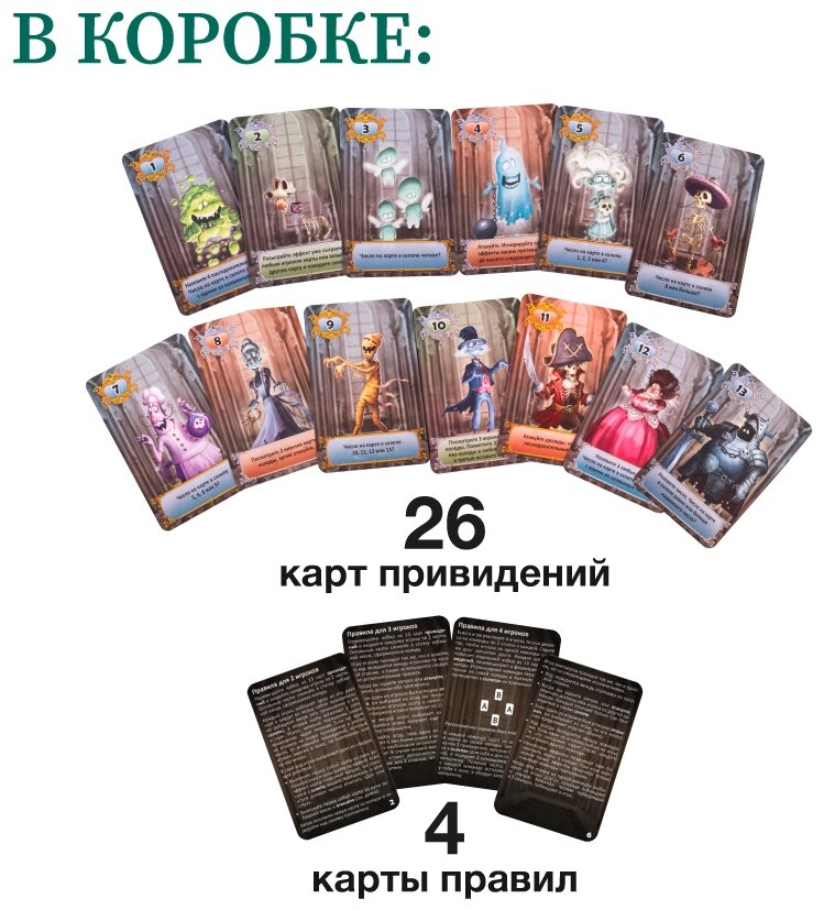 | Комплектация | карты привидений - 26 шт.; карты правил - 4 шт. |