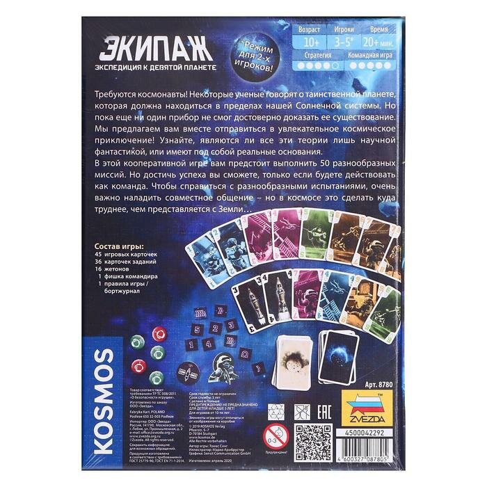 | Комплектация | Игровые карточки – 45 шт.?; Карточки заданий – 36 шт.; ? Жетоны – 16 шт.; ? Фишка командира – 1 шт.?; Правила/Бортжурнал |