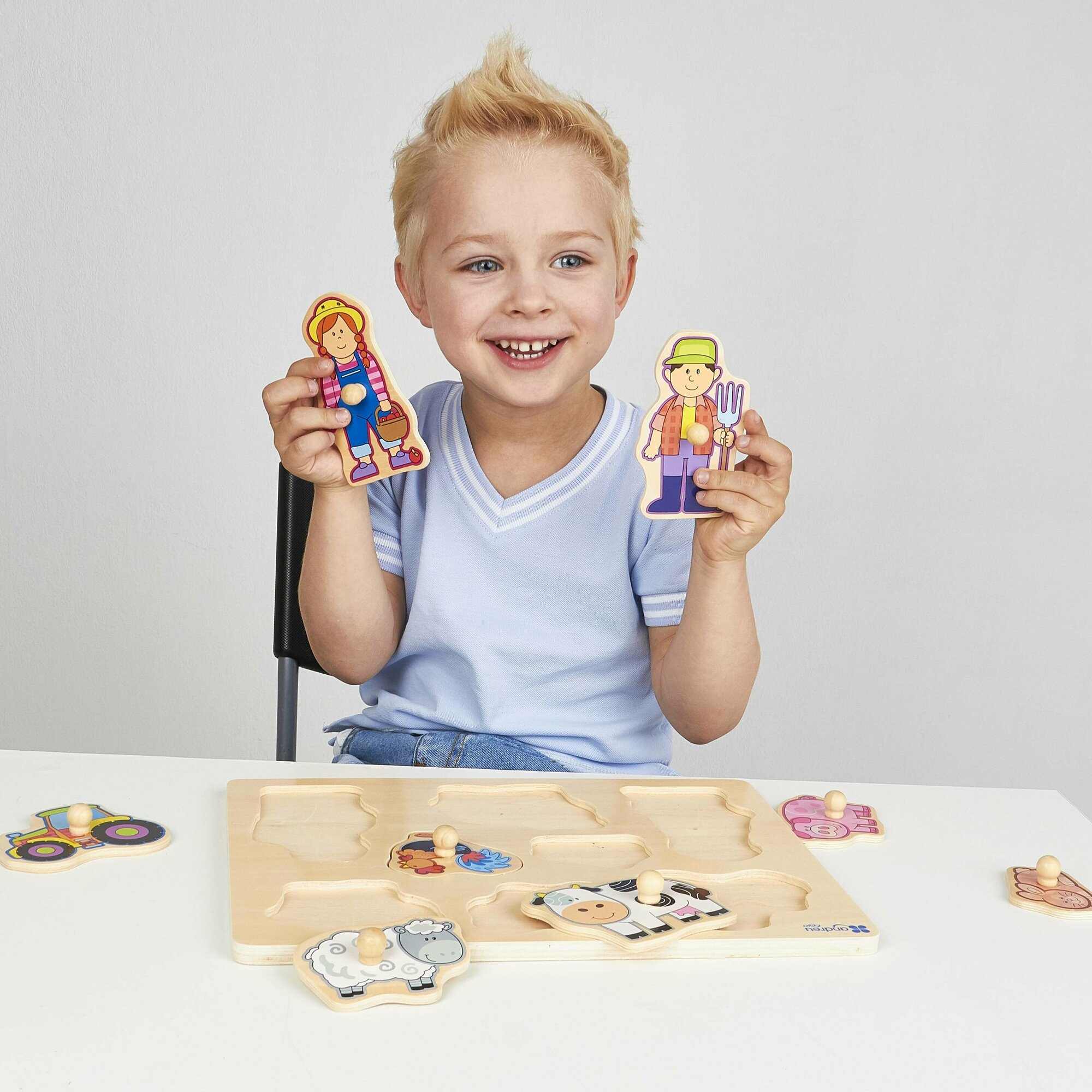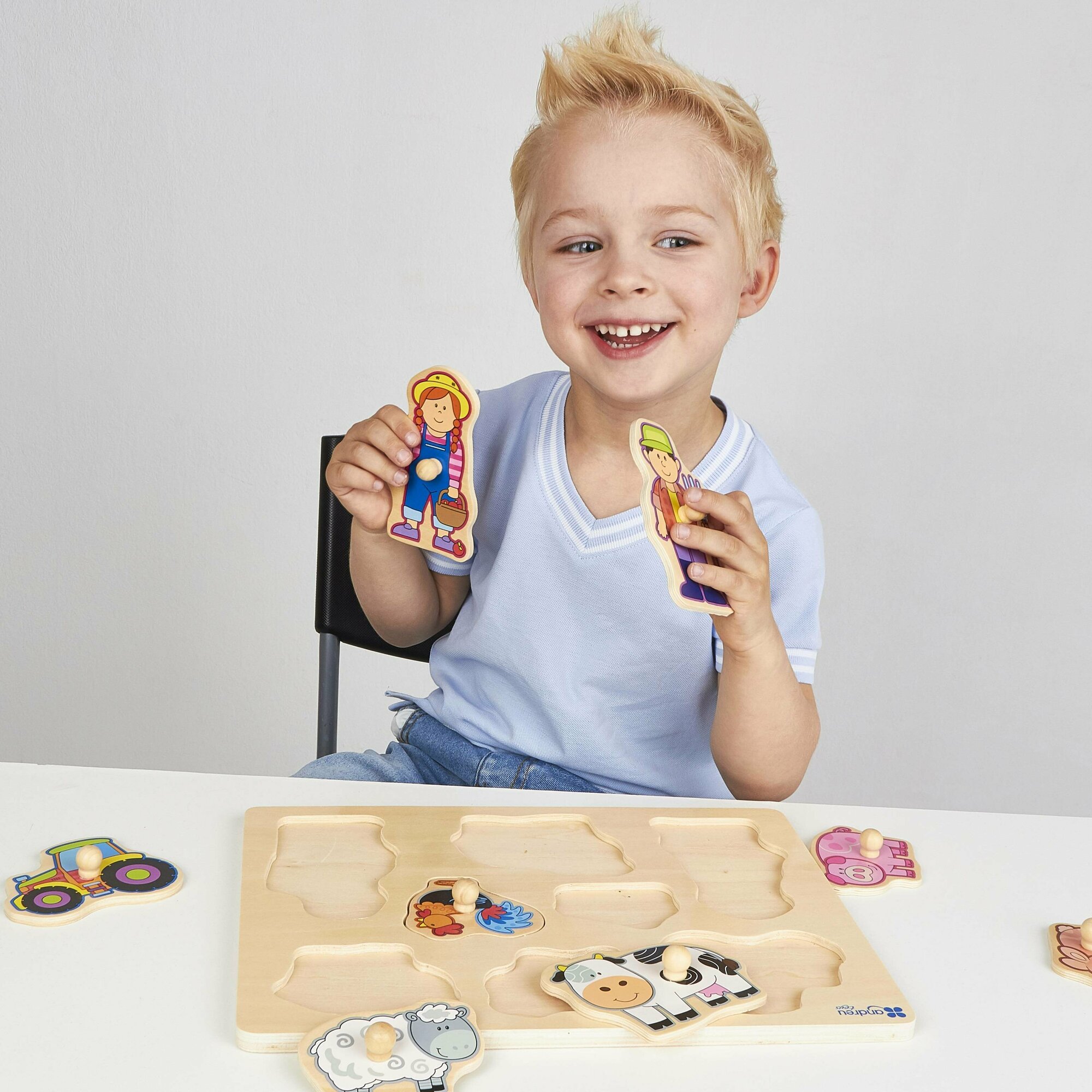 В наборе вы найдете рамку, а также 8 деталей-пазлов. Детали-пазлы представляют собой красочные фигурки обитателей фермы. Все пазлы имеют округлые края, поэтому полностью безопасны для игры. Чтобы ребенку было удобнее работать с такими пазлами, каждый из них оснащен специальной небольшой рукоятью круглой формы, за которую удобно браться, чтобы достать пазл из рамки или наоборот поместить необходимый элемент в нее.