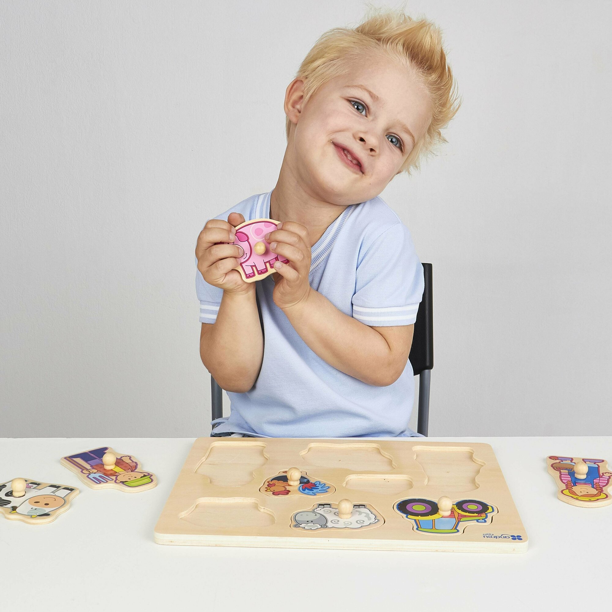 Детали изготовлены из прочной шлифованной древесины, абсолютно безопасной для здоровья детей , и вкладышей, на которые наклеены веселые рисунки.