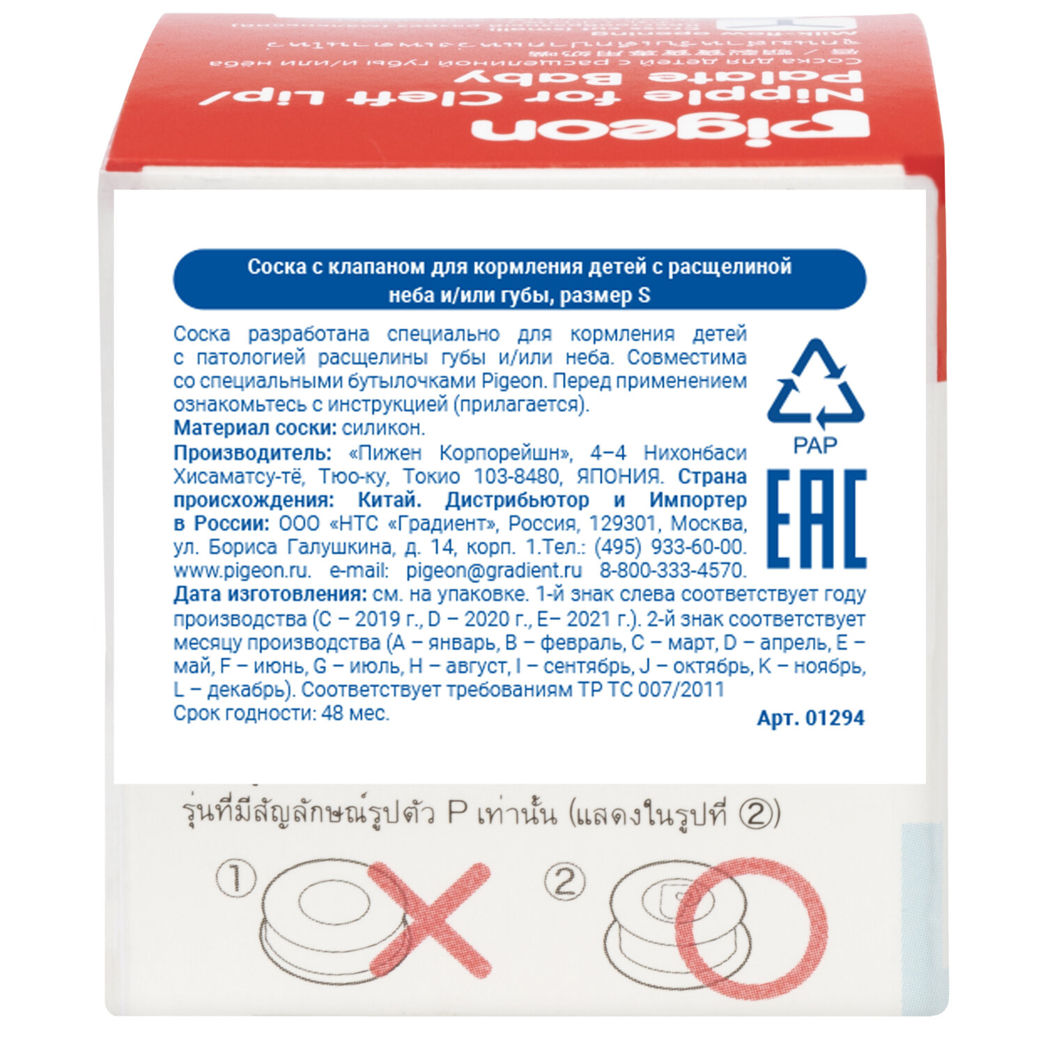 Pigeon Соска S с клапаном для кормления детей с расщелиной неба и губы силикон (01294)