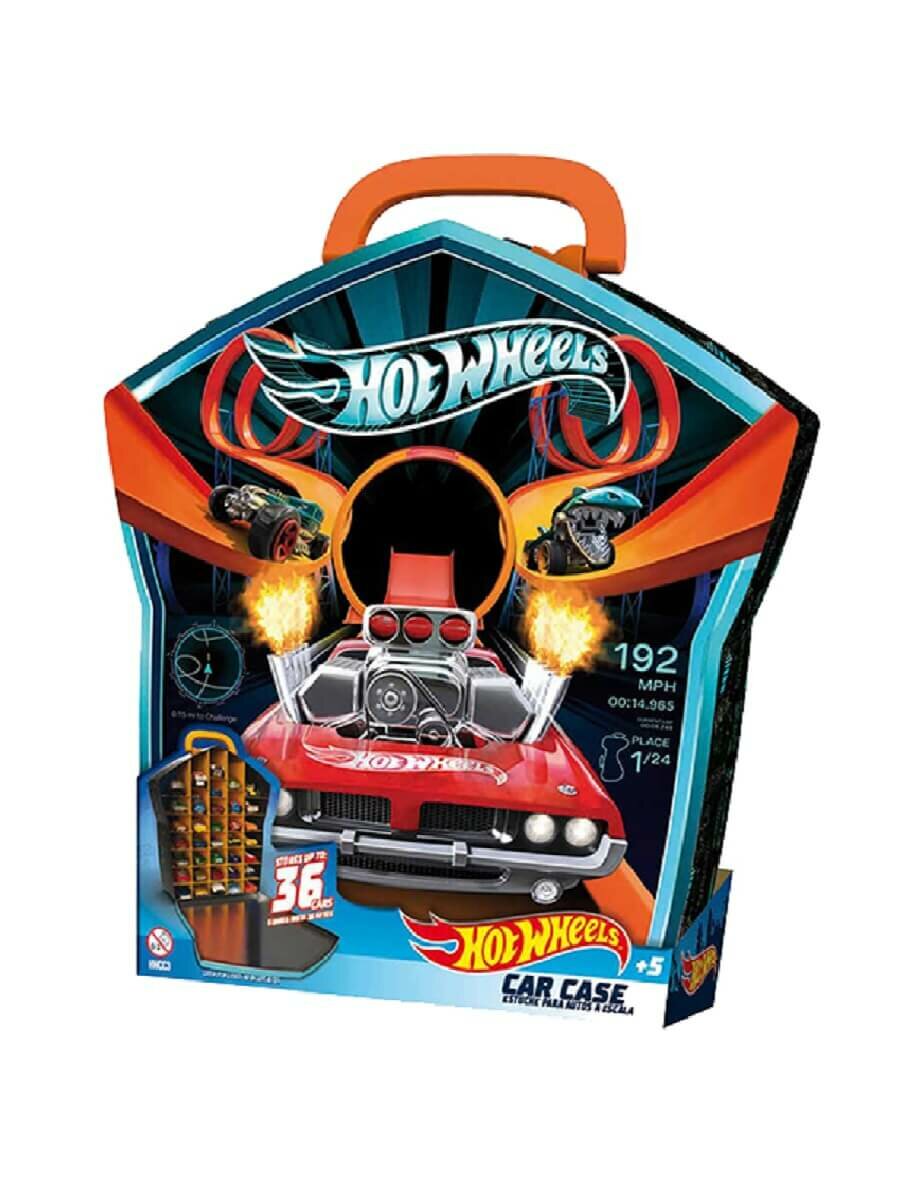Портативный кейс для хранения 36 гоночных машинок Hot Wheels. Прочная, яркая металлическая коробка с рельефным изображением машинок Hot Wheels на лицевой части. Закрывается сбоку на металлический замочек. Внутри вкладыш из ПВХ с 36 ячейками для удобного хранения машинок. Сверху металлическими заклепками прикреплена пластиковая ручка, чтобы взять свои любимые игрушки с собой в путешествие или просто в гости к другу. Переносной гараж для машинок с оригинальным дизайном и фирменной символикой придется по душе юному гонщику, и кроме того, наведет порядок в его автопарке!