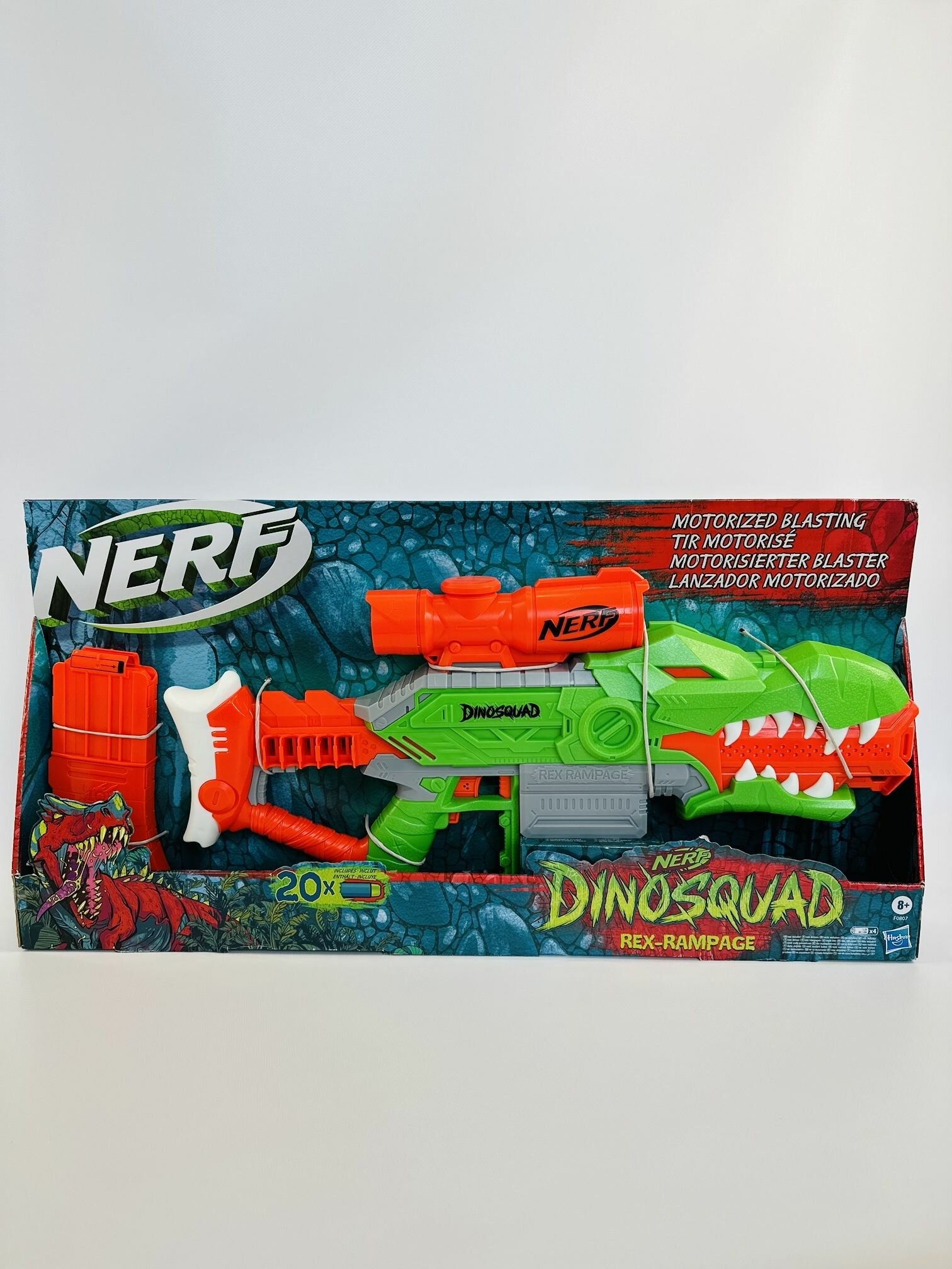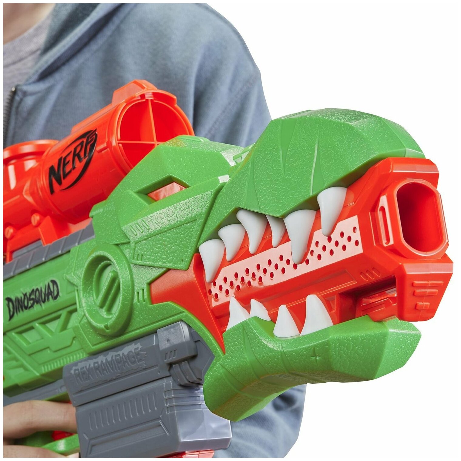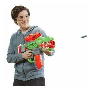 - Моторизованный бластер Нёрф “Ярость Ти-Рекса” серии DinoSquad выполнен со стилизацией под тираннозавра, передавая его узнаваемый образ