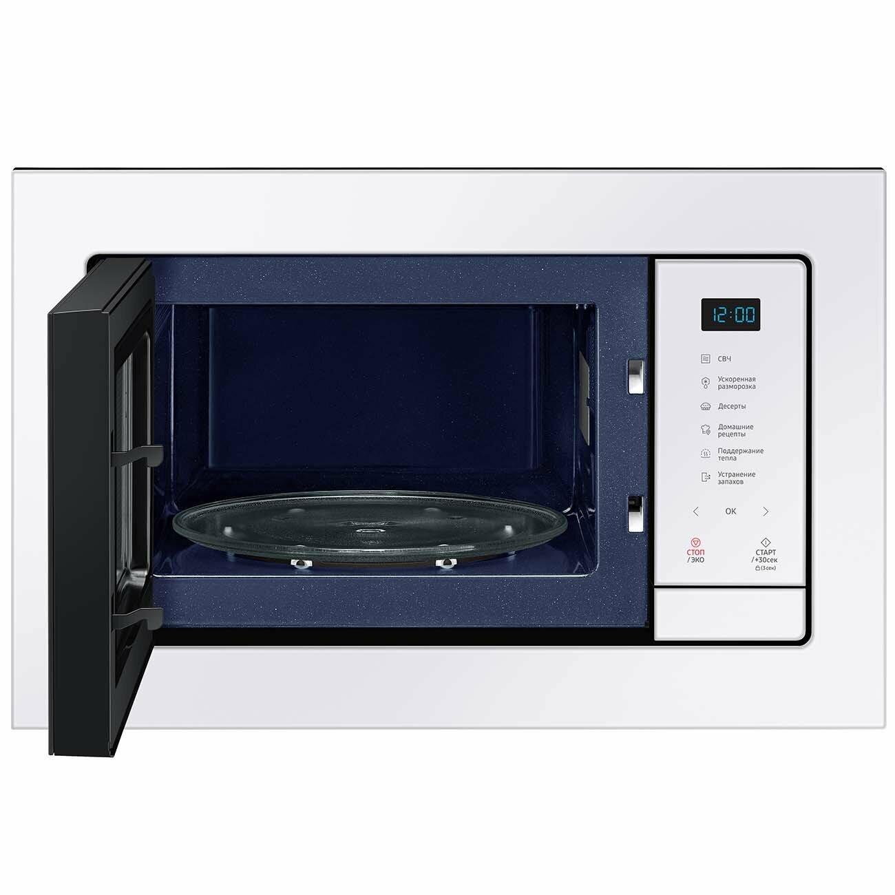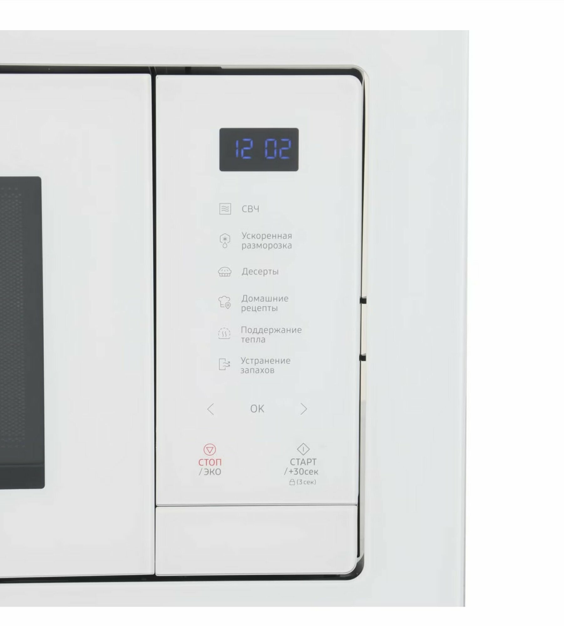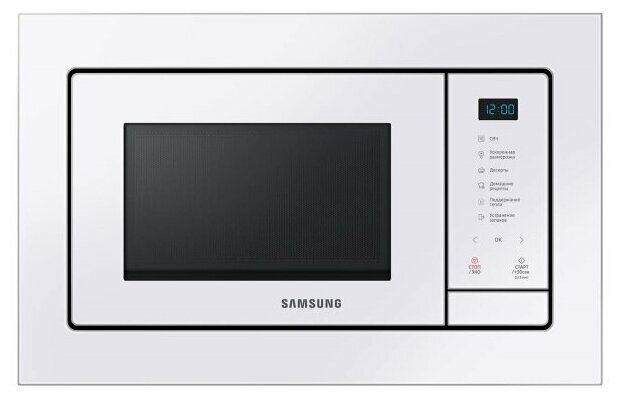 | Прочие особенности и свойства | Встраиваемая микроволновая печь Samsung MG20A7013AT может готовить блюда по десяткам рецептов. Автоматические программы максимально облегчают задачу – вам достаточно указать массу продуктов, чтобы выбрать подходящие настройки., , ВСТРОЕННЫЙ ГРИЛЬ, Зажаривайте мясо и рыбу до хрустящей корочки, запекайте сочные овощи. Используйте комбинированные режимы с микроволнами, чтобы ускорить приготовление., , ПРАКТИЧНО И БЕЗОПАСНО, Гладкое и прочное биокерамическое покрытие замедляет развитие бактерий на 99%. Оно легко отмывается от жира и всегда сохраняет ощущение свежести., , УДОБНЫЕ ФУНКЦИИ, Режим быстрого размораживания придёт на помощь, если вы забыли заранее достать продукты из холодильника. Блокировка панели управления сделает устройство недоступным для детей. |