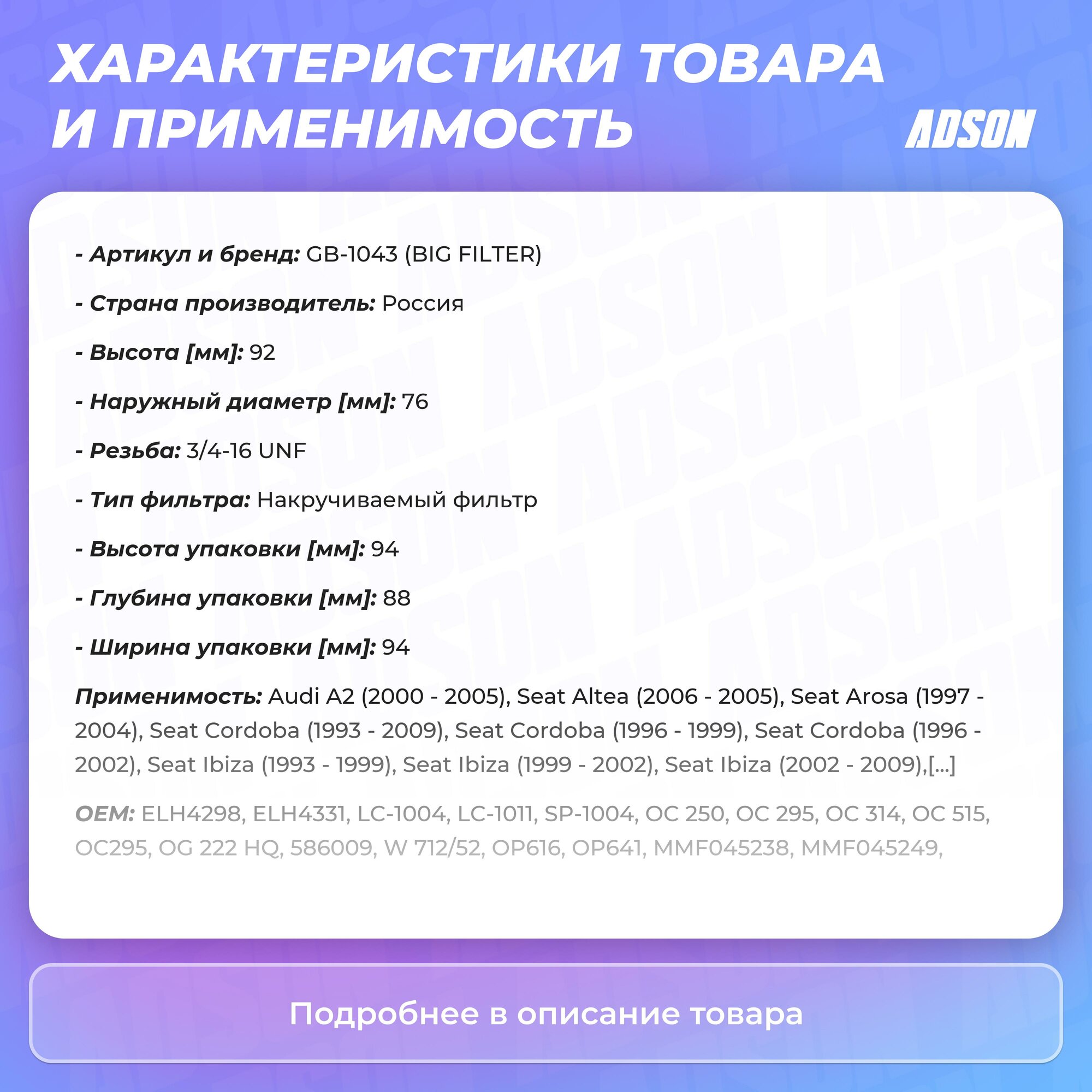 Сервис сравнения цен СкидкаГИД предлагает сравнить цены на товар «Фильтр масляный BIG FILTER GB-1043»