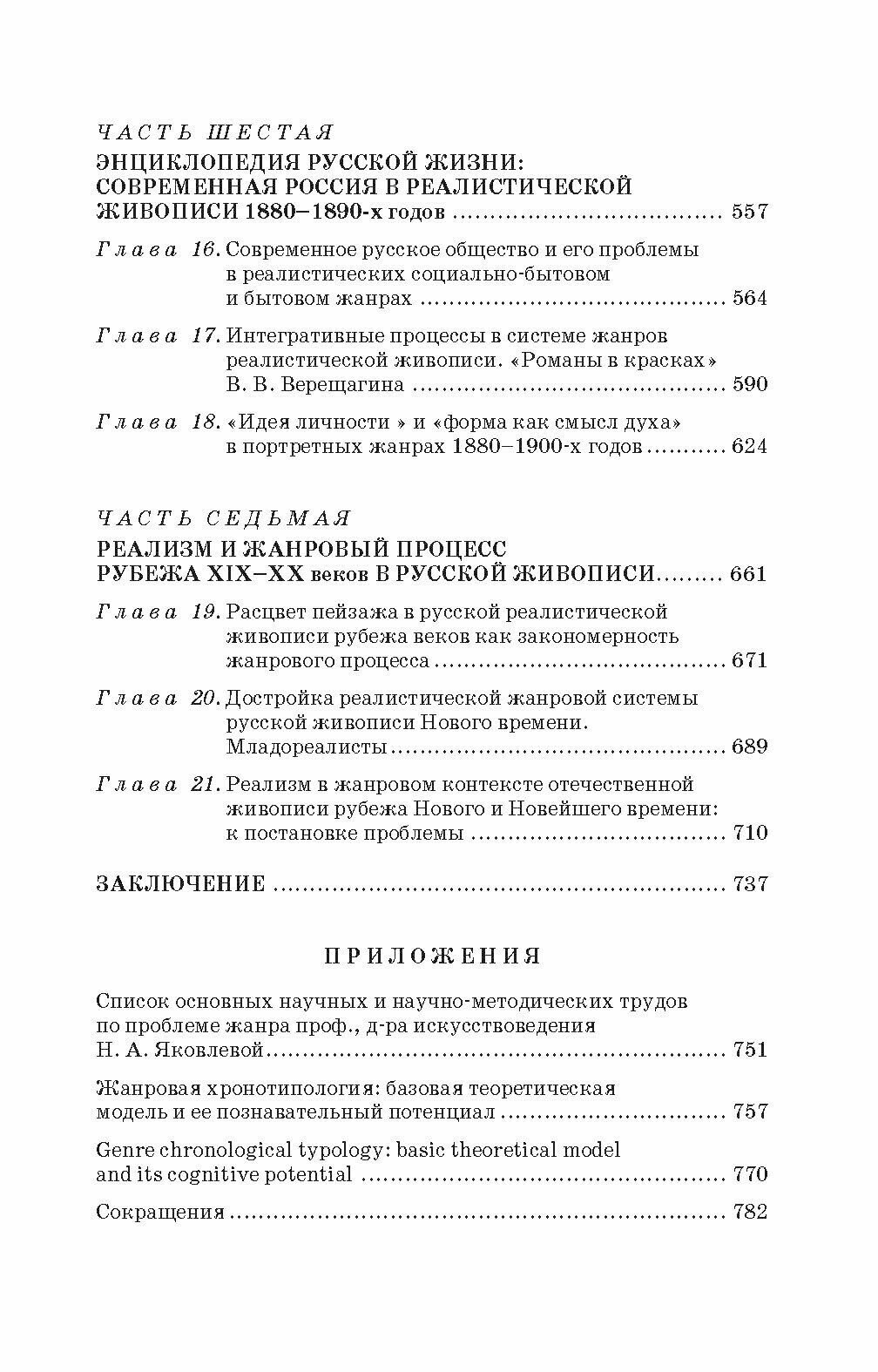 В монографии Н. А. Яковлевой русская реалистическая живопись Нового времени впервые описана как жанровая хронотипология - целостная исторически развивающаяся система жанров. Исследованы все этапы развития системы - от ее скрытого зарождения в недрах художественного процесса (первая половина ХIХ века), революционного становления в 1860-е годы и до вершины реализации ее программы в диахронной жанровой структуре в 1890-1900-е годы. Определены координаты реализма в жанровой сверхсистеме русской живописи Нового времени и намечены пути изучения межсистемных связей в широком контексте отечественного и мирового искусства. Жанровая модель дала возможность выявить некоторые скрытые дотоле закономерности жанрового процесса и прояснить его логику и флюктуации.