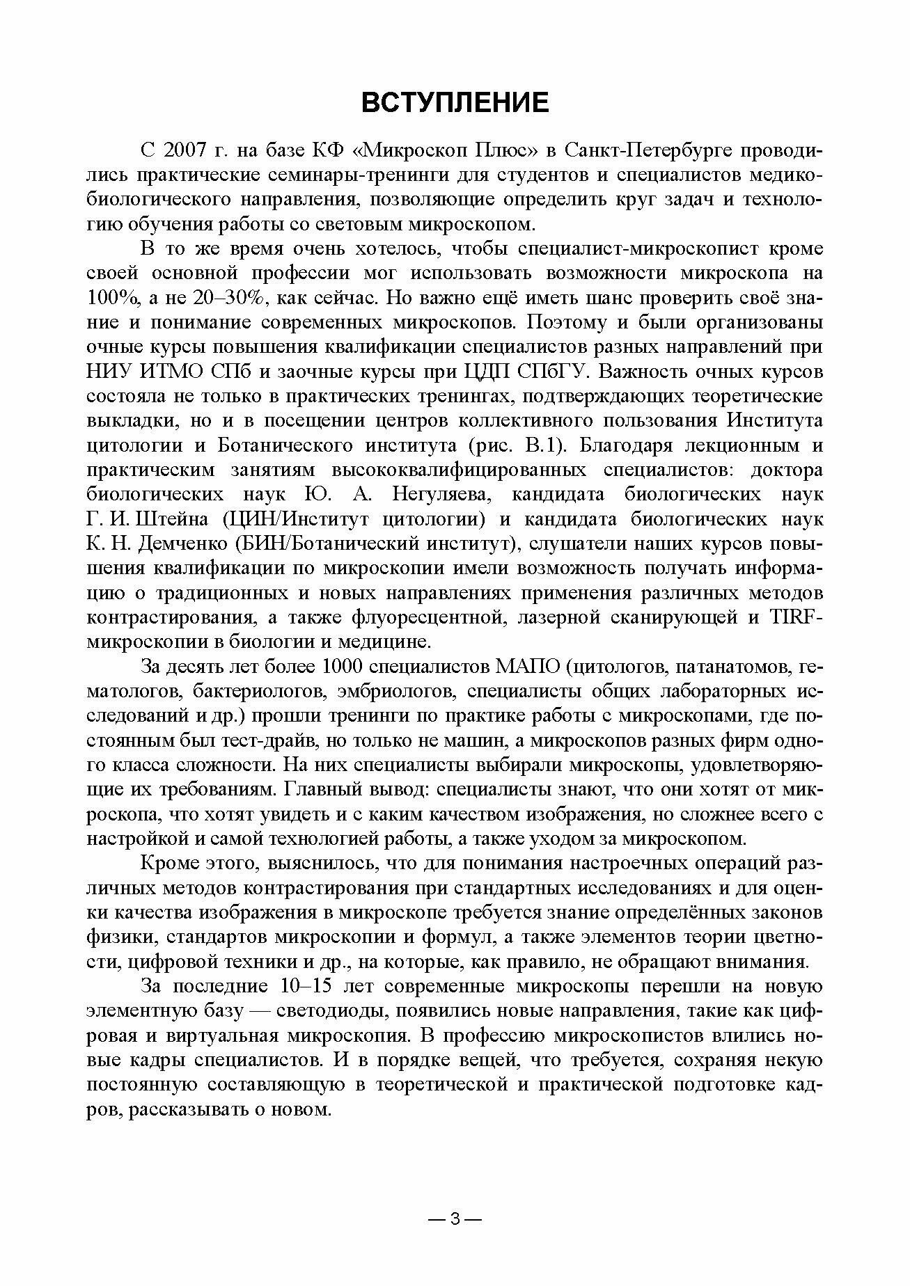 Материалы, используемые в данной книге, являются результатом экспериментальных работ, проводимых на протяжении 2007–2019 гг., на современном оборудовании, которое находилось в демозале фирмы ООО «КФ Микроскоп Плюс», Санкт-Петербург, предоставляемых фир-мами-импортерами ООО «Шелди», Москва (микроскопы «Motic», Китай); ООО «ОПТЭК», Москва (микроскопы «Carl Zeiss», Германия), ООО «Олим-пас Москва» (микроскопы «Olympus», Япония); МО «Отдел Медицинской Техники», Екатеринбург (микроскопы «Micros», Австрия) и Компания «Levenhuk», Москва — СПб (микроскопы «Levenhuk», США). Предложе-ны результаты апробации современных микроскопов разных фирм и мнение специалистов медико-биологического направления, полученные на тренингах по микроскопии (2009–2019). Приведены результаты экспе-риментов, проведенных с помощью виртуальных тренингов фирм Zeiss, Olympus, Nikon. В показе настроек и работы с микроскопом приняли участие слушатели курсов МАПО СПб, НИУ ИТМО, СПбГУ, студенты и любители-микроскописты. Сервисные работы и показательные экспери-менты с системами анализа изображения и камерами проведены сотруд-никами фирмы ООО «КФ Микроскоп Плюс», СПб.