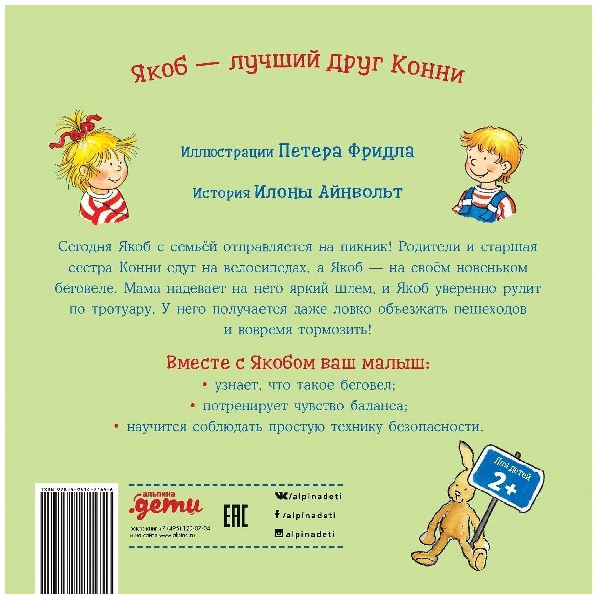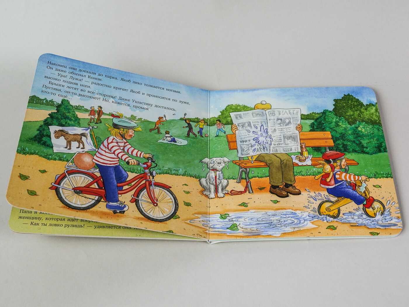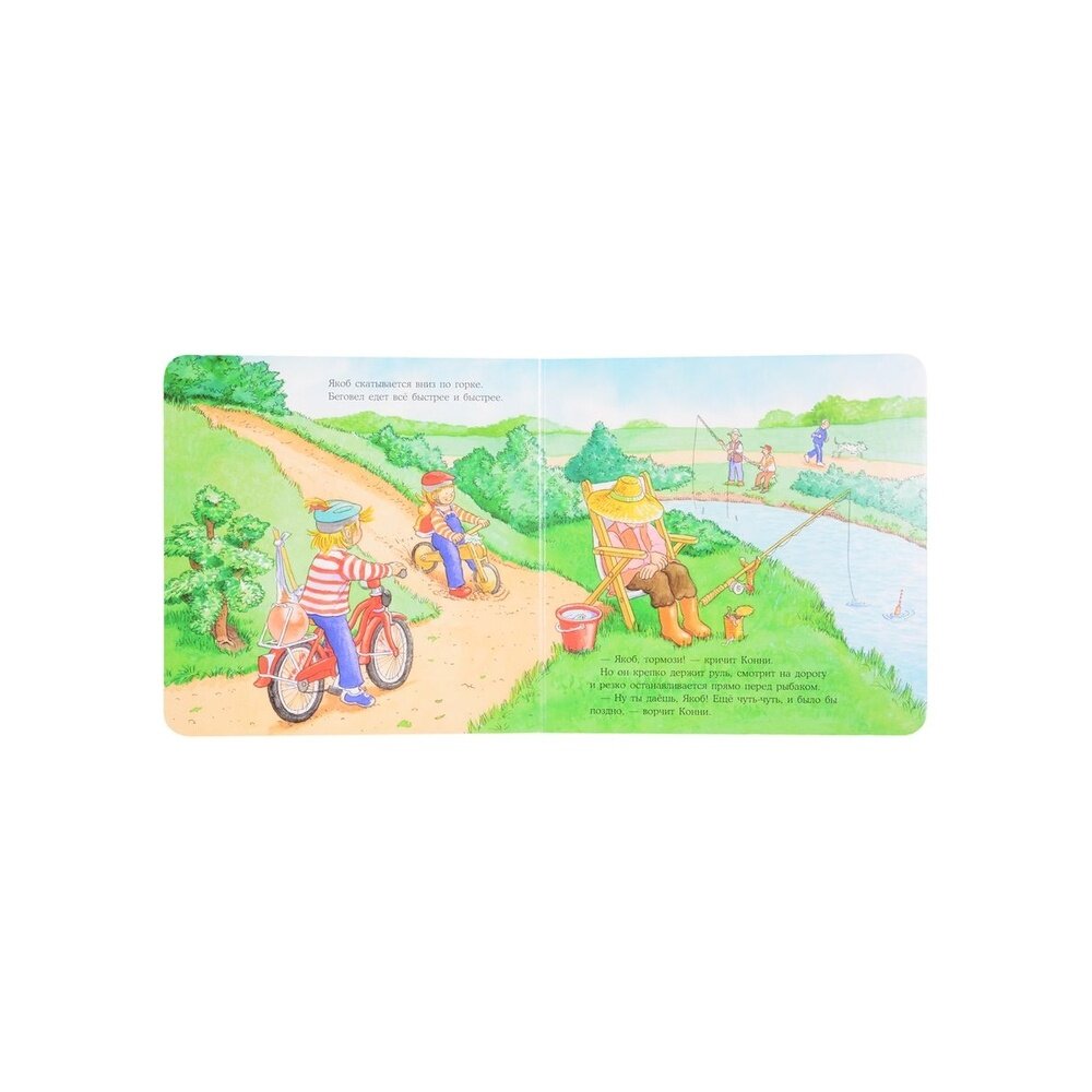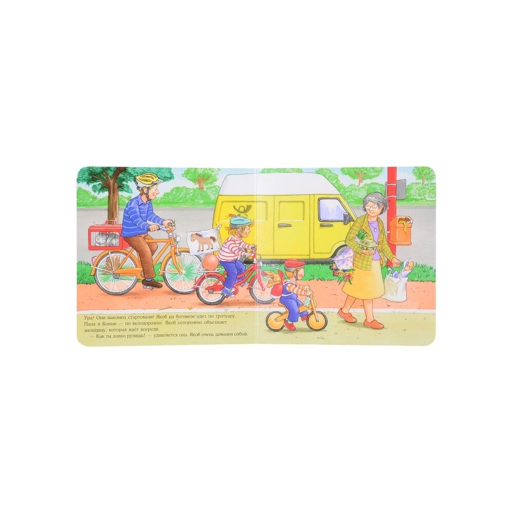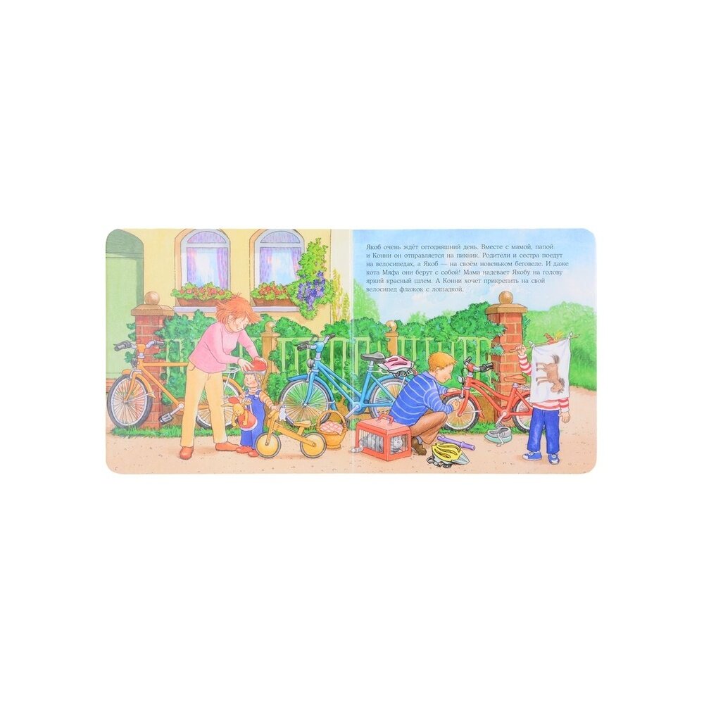 Сегодня Якоб с семьёй отправляется на пикник! Родители и старшая сестра Конни едут на велосипе-дах, а Якоб — на своём новеньком беговеле. Мама надевает на него яркий шлем, и Якоб уверенно рулит по тротуару. У него получается даже ловко объезжать пешеходов и вовремя тормозить!