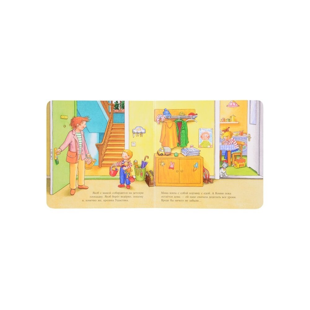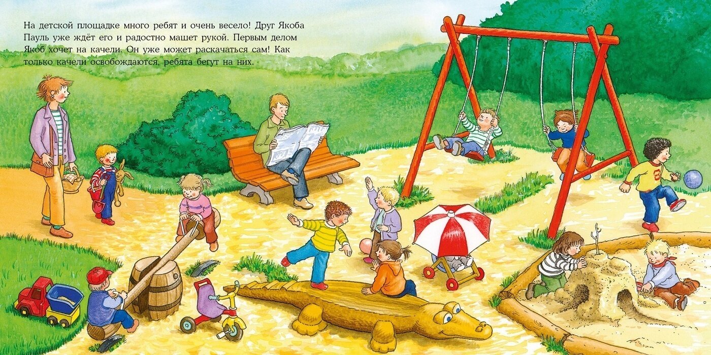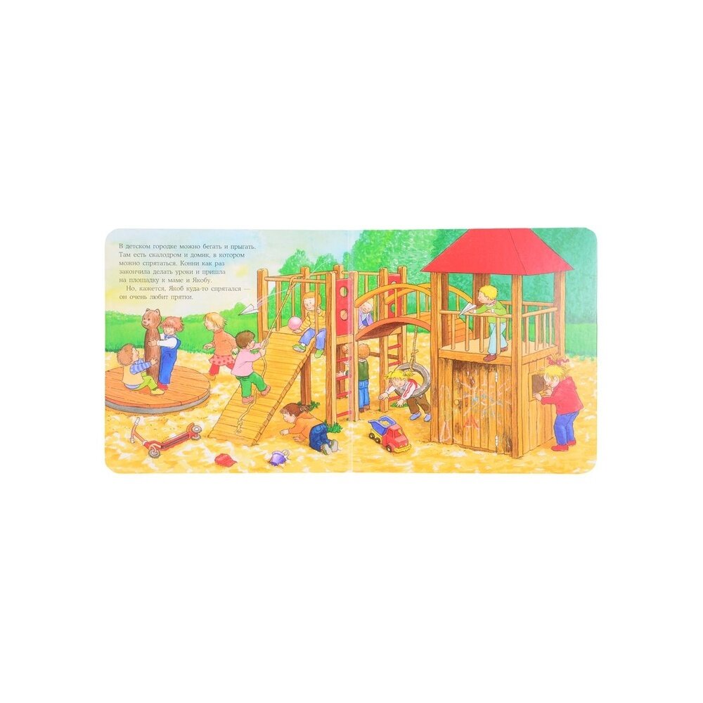 Якоб идёт на детскую площадку. Там его уже ждет друг Пауль и другие ребята. На площадке столько всего интересного: можно качаться на качелях, лепить куличики и играть в прятки! Главное, быть внимательным и не уходить далеко от мамы. Вместе с Якобом ваш малыш точно запомнит, что нельзя гулять без присмотра взрослых, узнает, как вести себя на детской площадке, будет смелее чувствовать себя на прогулках.