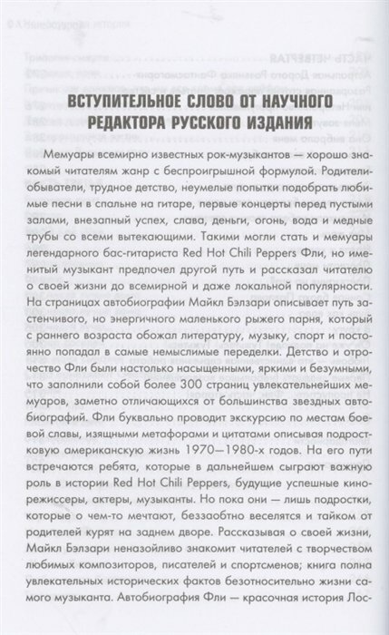 Страницы пропитаны музыкой - это то, чего ждёшь от книги музыканта, а получаешь, увы, не всегда. Здесь же ярчайший пример, когда человек звучит в каждой истории, начиная с трудных детских лет и дальше, с приходом славы. Приятно убедиться, что довольно своеобразный на сцене Фли ещё и умный и образованный парень. Он пишет удивительно хорошо, с эмоцией и фирменным юмором. -