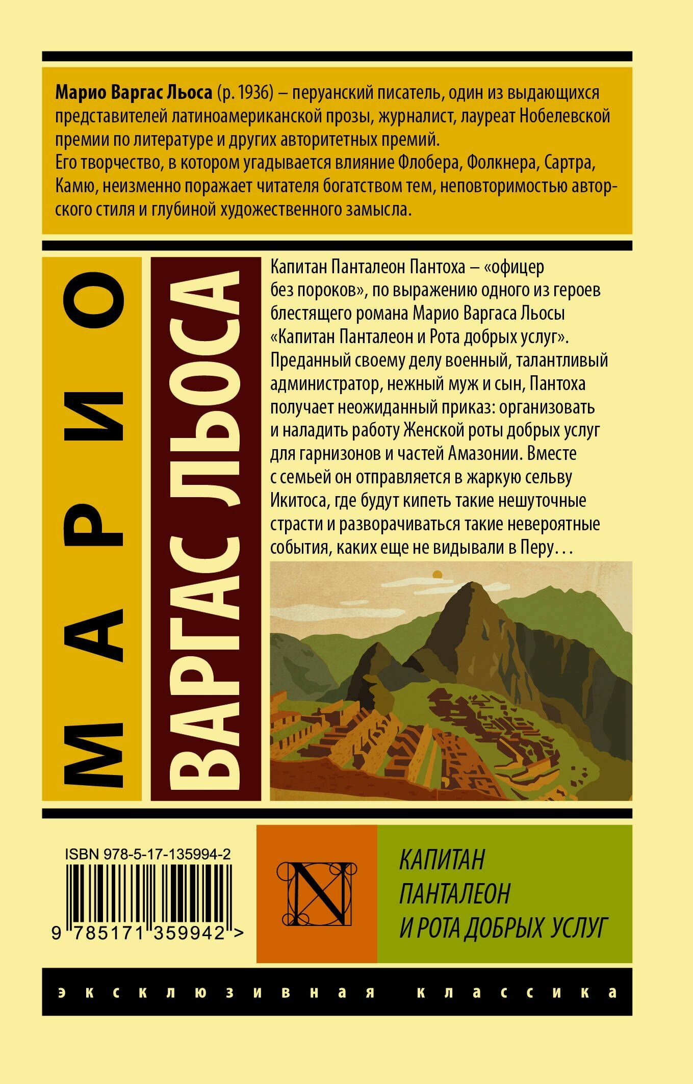 На сегодняшний день товар «Книга: Капитан Панталеон и Рота добрых услуг (Марио Варгас Льоса); АСТ, 2021» можно купить с кешбеком в 5 магазинах: ЛитРес, Читай-город, book24, Яндекс.Маркет, Буквоед