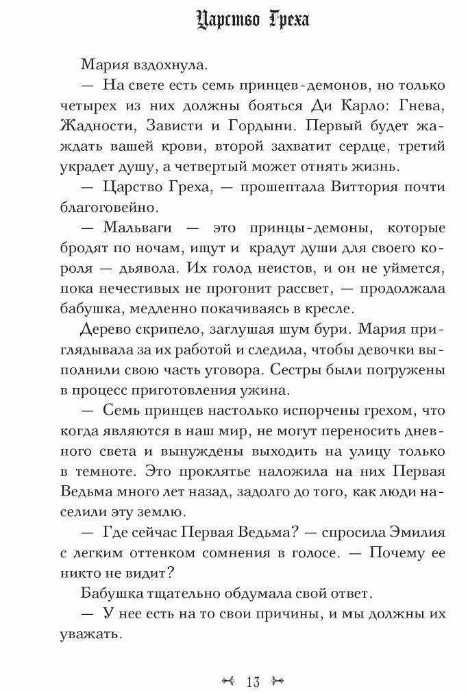 Две сестры-близняшки Эмилия и Виттория - ведьмы, но не сильно заморачиваются и не верят в семерых принцев ада: Гнев, Гордыню, Зависть... (сразу становится ясным название книги), о которых предупреждает бабушка. Но только до того момента, как Витторию находят мертвой с вырванным сердцем. И горюющая Эмилия начинает расследование...