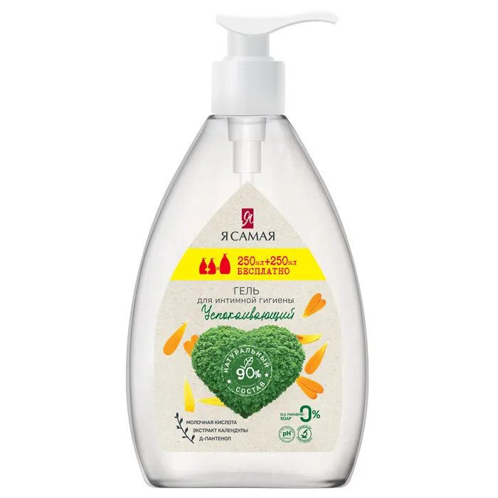 Гель для интимной гигиены Я самая Успокаивающий, 500 млУспокаивающий гель для интимной гигиены Я Самая с календулой 90% натуральный состав - бережный к нежной коже. Особые компоненты: Молочная кислота - поддерживает естественный рН интимной области, защищает микрофлору и способствует ее нормализации; Календула - дарит увлажнение и успокаивает кожу; Д-пантенол обладает противовоспалительным свойством, смягчает, снимает раздражение и ощущение дискомфорта. Забота о природе, забота о себе! Состав: Aqua, sodium laureth sulfate, cocamidopropyl betaine, disodium laureth sulfosuccinate, disodium cocoamphodiacetate, sodium chloride, panthenol, calendula officinalis extract, citric acid, lactic acid, methylchloroisothiazolinone, methylisothiazolinone, parfum. Применение: Используйте небольшое количество геля для очищения интимных участков тела. Тщательно смойте теплой водой. Подходит для ежедневного применения.