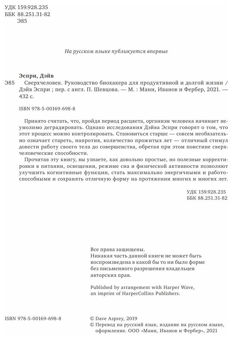 Очень редко, когда я искренне не рекомендую читать какую-либо книгу. Труд Дэйва Эспри «Сверхчеловек. Руководство биохакера для продуктивной и долгой жизни», вышедший в издательстве «Манн, Иванов и Фербер», я читать не рекомендую.