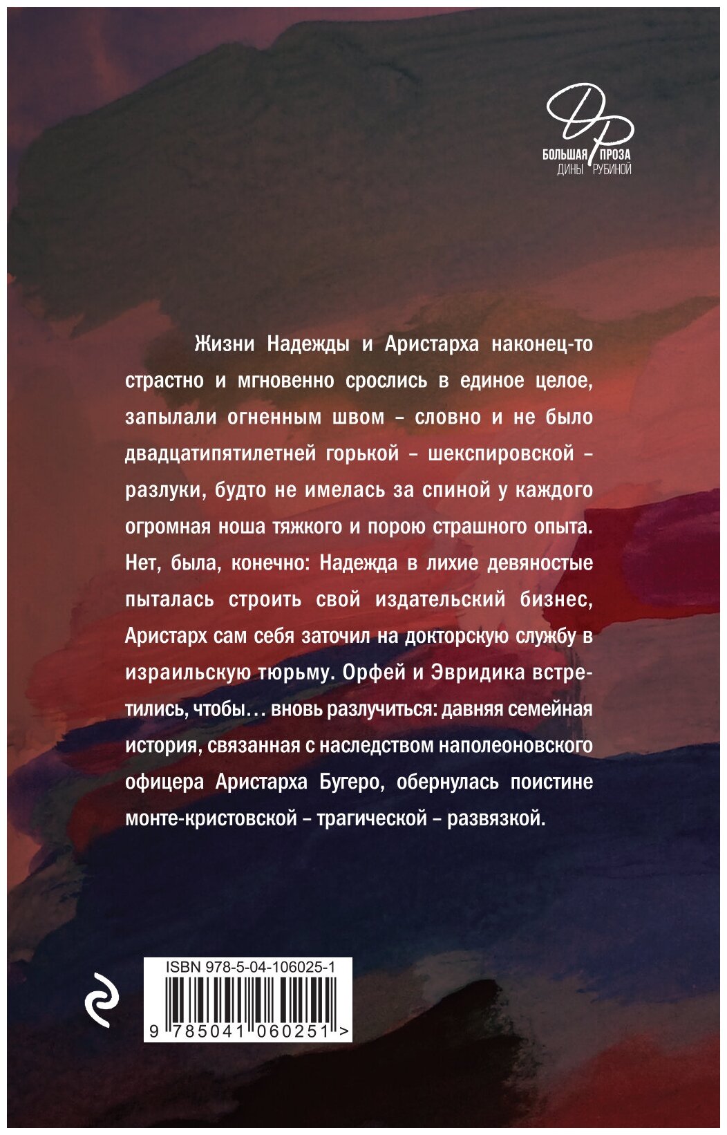 Жизни Надежды и Аристарха наконец-то страстно и мгновенно срослись в единое целое, запылали огненным швом – словно и не было двадцатипятилетней горькой – шекспировской – разлуки, будто не имелась за спиной у каждого огромная ноша тяжкого и порою страшного опыта. Нет, была, конечно: Надежда в лихие девяностые пыталась строить свой издательский бизнес, Аристарх сам себя заточил на докторскую службу в израильскую тюрьму. Орфей и Эвридика встретились, чтобы… вновь разлучиться: давняя семейная история, связанная с наследством наполеоновского офицера Ариcтарха Бугеро, обернулась поистине монте-кристовской – трагической – развязкой.