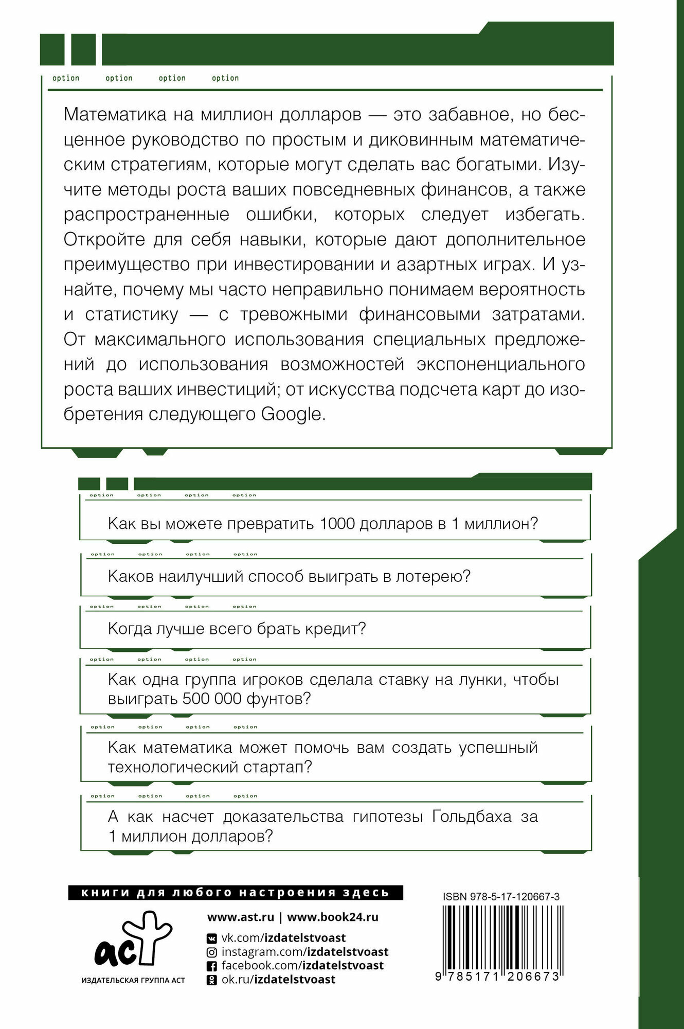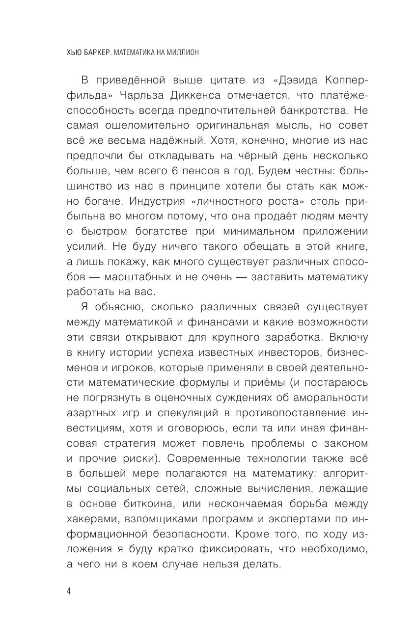 -  Иван^2- 8 марта 20222/5 Хью Баркер даёт читателю советы: как обыграть казино, делать обдуманные ставки у букмекеров. Математика в книге проста, с ней разберётся даже не математик! Автор приводит потрясающие случаи, как некоторым счастливчикам удалось благодаря математике выиграть миллионы (или заработать). Так один счастливчик научился определять выигрышные билеты в моментальной лотерее (где надо было стереть ряд закрытых полей) по их внешнему виду. Смотрите, считайте, богатейте!