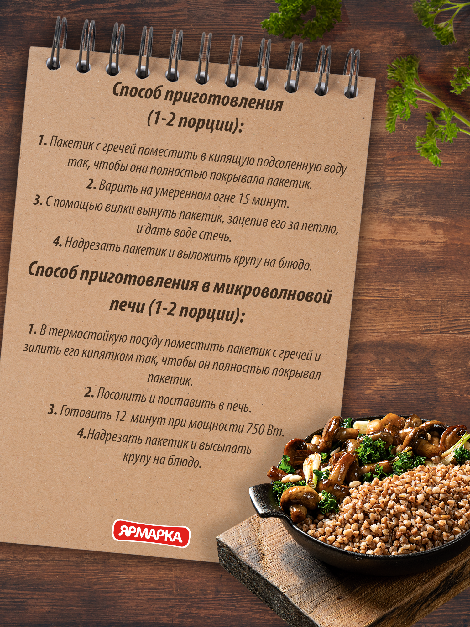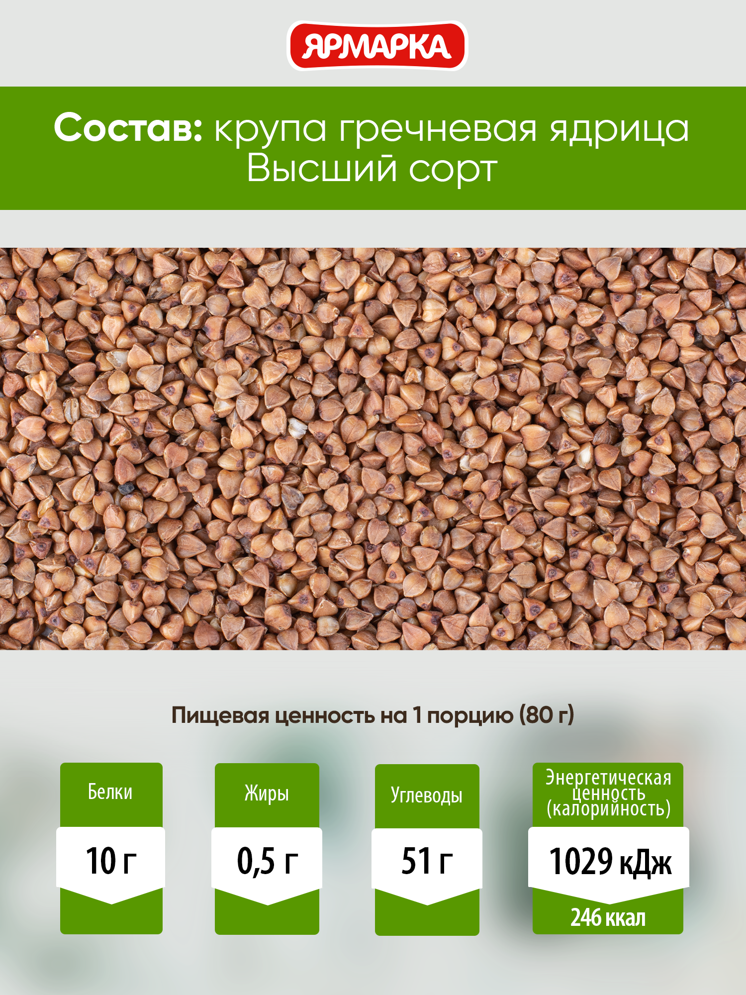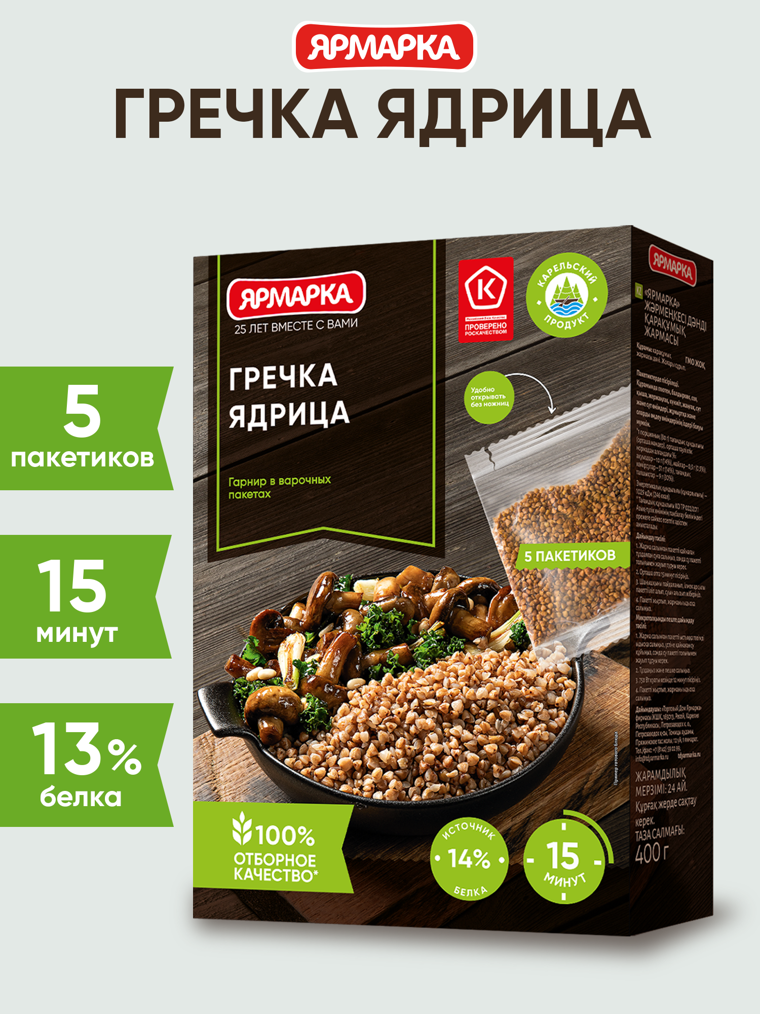 Ярмарка Гречка ядрица фермерская 400 г Учёные считают, что гречневая крупа родом из Индии и Непала. Именно там стали выращивать этот злак четыре тысячи лет назад. В Россию она попала из Греции, поэтому и дали ей такое название. На производстве зерно гречихи подвергают тепловой обработке паром, очищают от оболочки. Специальное оборудование Sortex позволяет сортировать зернышки по размеру, удаляя продел и сор. Поэтому греча ядрица от Ярмарки славится хорошим качеством. Полезные свойства гречневой крупы давно известны, это одна из самых полезных круп. Она богата белком, витаминами группы В, железом и фосфором, цинком и магнием. В ней есть жиры, но особые, полиненасыщенные, а также пищевые волокна. Они помогают организму бороться с лишним весом, снижают уровень холестерина. Поэтому гречневая диета так популярна среди желающих похудеть. В грече содержится рутин – витамин Р, который укрепляет стенки кровеносных сосудов, непосредственно участвует в окислительно-восстановительных процессах). Употребление гречи рекомендуется при тяжелых физических нагрузках, при нарушении обмена веществ, для укрепления сердечно-сосудистой системы, для профилактики атеросклероза. Питательная ценность гречневой крупы такова, что её сравнивают с мясом и бобовыми. В ней много медленных углеводов, которые легко усваиваются организмом и дают ощущение сытости надолго. Гречу рекомендуют включать в рацион диабетикам и гипертоникам. Она полезна всем без исключения.