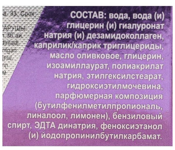 | Состав | вода; пропиленгликоль; гидролизованный эластин; растворимый коллаген; масло оливковое; глицерин; глицерилстеарат цитрат; цетеариловый спирт; моностеарат глицерина; изоамиллаурат; каприлик/каприк триглицериды; гидроксиэтилмочевина; моноглицериды дистиллированные; полиакрилат натрия; парфюмерная композиция (бензилсалицилат; цитронеллол; лимонен; линалоол; бутилфенилметилпропиональ); бензиловый спирт; эдта динатрия; феноксиэтанол; йодопропинилбутилкарбамат |