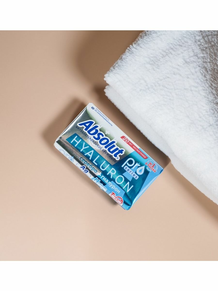 Антибактериальное твёрдое крем-мыло Absolut Pro с гиалуроном содержит новую антибактериальную формулу: масло чайногодерева и ионы серебра. Компоненты надёжно защищают кожу от вредоносных бактерий. А гиалурон в составе увлажняет и восстанавливает кож рук. Идеально подходит для повседневного использования.