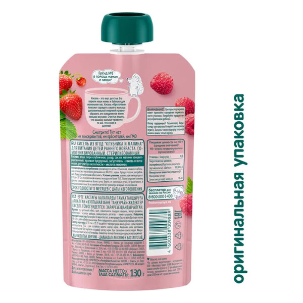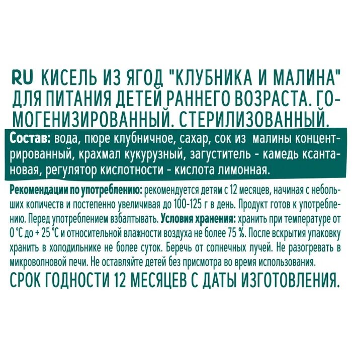 Описание товара:Кисель для питания детей раннего возраста. Гомогенизированный. Стерилизованный. Без искусственных добавок. Без консервантов. Без красителей. Без ГМО. Традиционные рецепты приготовления киселей ФрутоНяня делают их такими же вкусными, как дома!Состав товара:Вода, пюре клубничное, сахар, сок из малины концентрированный, крахмал кукурузный, загуститель - камедь ксантановая, регулятор кислотности - кислота лимонная. Калий: 10-40 мг. Колпачок: полиэтилен.Способ приготовления:Рекомендуется детям с 12 месяцев, начиная с небольших количеств и постепенно увеличивая до 100-125 г в день. Перед употреблением взбалтывать.Меры предосторожности:Хранить при относительной влажности воздуха не более 75%. После вскрытия упаковку хранить в холодильнике не более суток. Беречь от солнечных лучей. Не разогревать в микроволновой печи. Не оставляйте детей без присмотра во время использования. Внимание! При транспортировке может произойти нарушение герметичности упаковки. Попробуйте продукт перед кормлением ребёнка. Внимание! Содержит игрушку "колпачок-конструктор". Игрушка предназначена для детей до 3 лет. После того, как колпачок снят с упаковки пищевого продукта, его можно использовать как составную часть конструктора. Игрушка должна использоваться под присмотром взрослых. Не содержит мелких деталей. Не требует особых условий хранения. При необходимости игрушку помыть в мыльной воде.