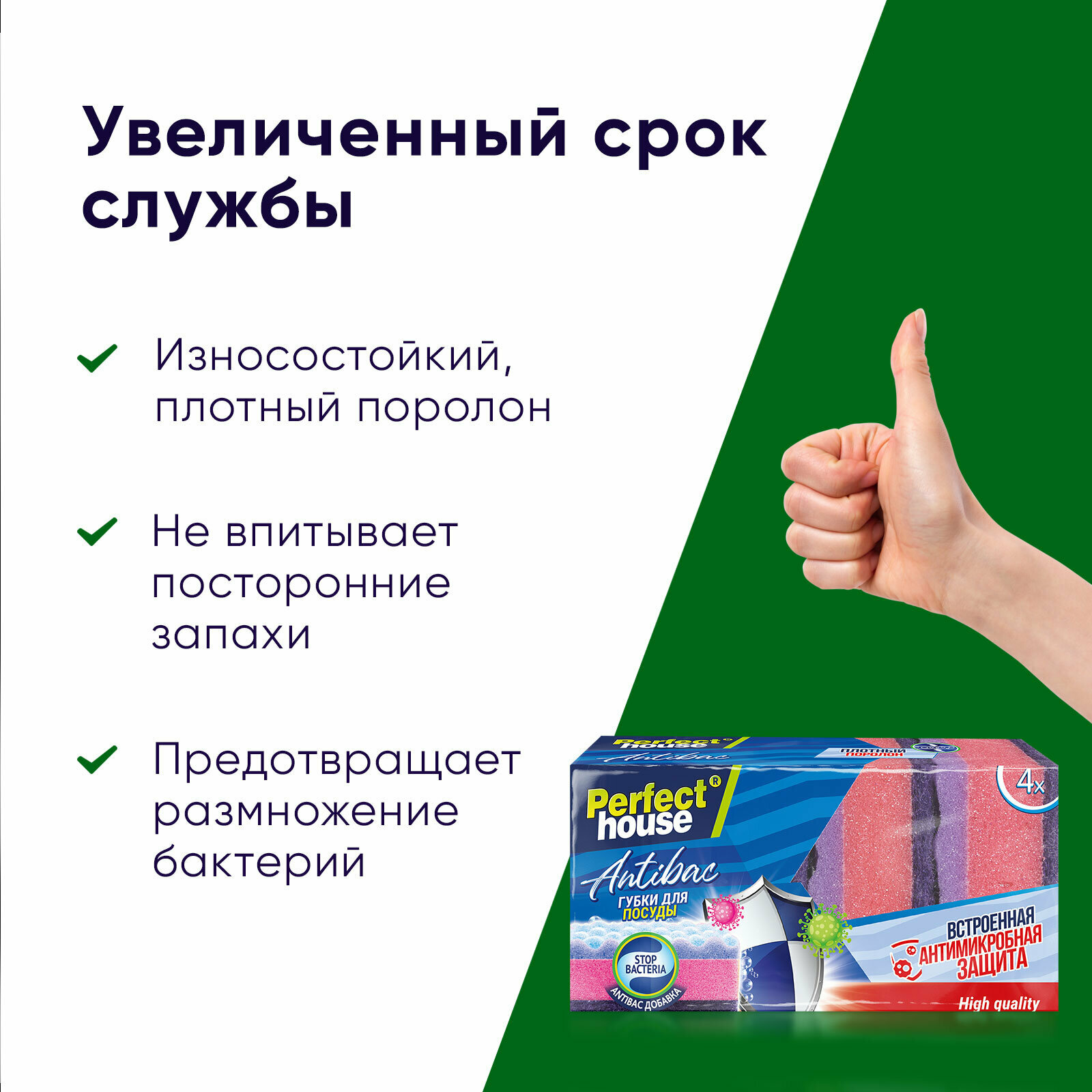 Губки для мытья посуды Antibac торговой марки Perfect House имеют в своем составе специальную запатентованную антибактериальную добавку в поролон Sanitized, она предотвращает размножение микробов и бактерий всех видов. Поролон очень плотный, лучше вспенивает моющее средство, экономя его до 18%. Качественный жёсткий слой губки быстро удаляет сильные загрязнения. Специальный волнистый рельеф на поролоновой поверхности обеспечивает лучшее очищение. Большой размер губки, создает дополнительный комфорт в использовании и позволяет быстро отмыть большие поверхности. Станут незаменимыми помощниками на Вашей кухне! Perfect House - эксперт в уборке.