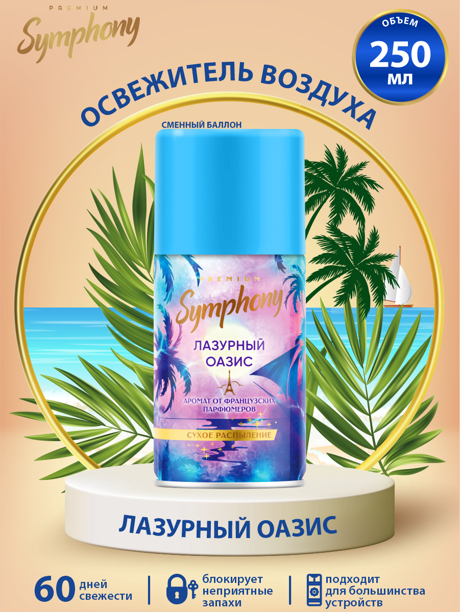 SYMPHONY Premium Сменный баллон для автоматического освежителя воздуха Лазурный оазис 250мл. Освежитель воздуха для устранения неприятных запахов, освежения и ароматизации воздуха в жилых и бытовых помещениях, ванных и туалетных комнатах, помещениях для курения. Подходит для большинства автоматических распыляющих устройств (систем ароматизации и дезодорации воздуха). Способ применения: Выключить устройство. Вставить (заменить) сменный баллон и установить временной интервал распыления согласно инструкции или указаниям по применению автоматического распыляющего устройства. После включения распыление начнется автоматически через несколько секунд. Включенное устройство держать в направлении "от себя". Соблюдать меры предосторожности. Сменный баллон можно использовать без автоматического устройства: встряхнуть баллон в течение 3 – 5 секунд и в направлении "от себя" распылить в разные стороны, нажав 2 – 3 раза на активатор.