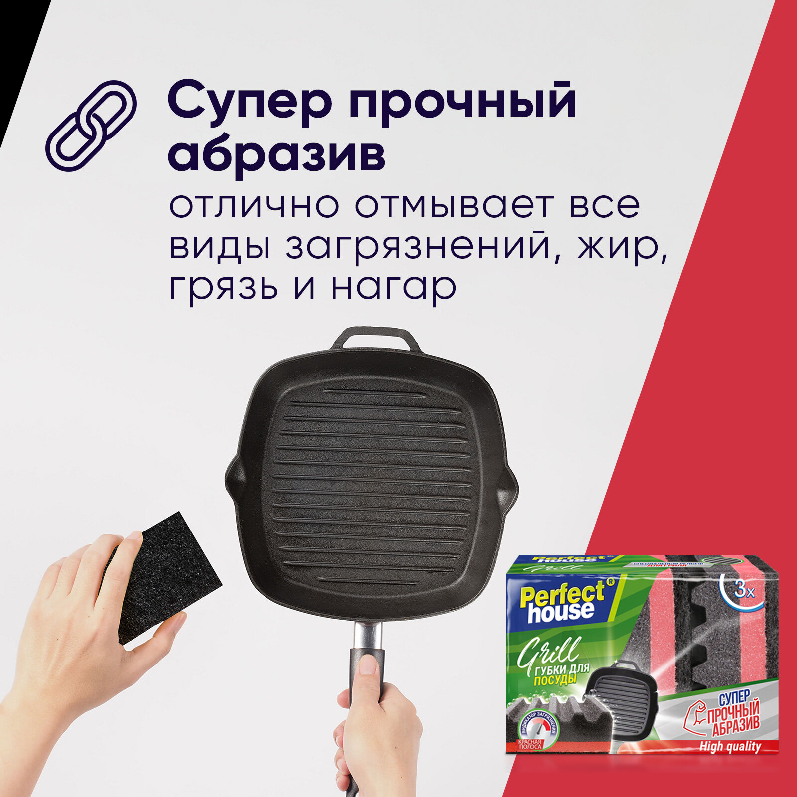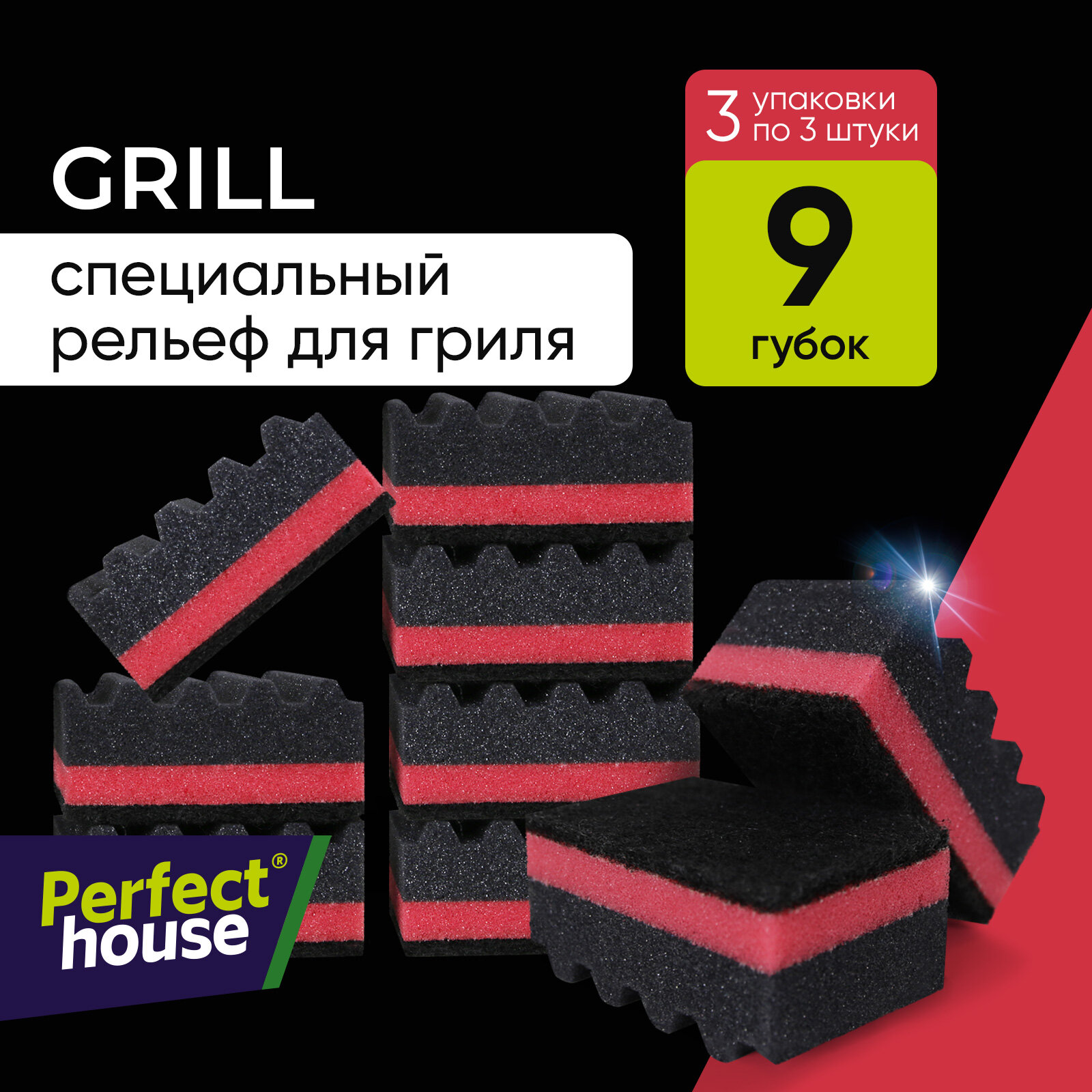 Губки для мытья посуды Grill торговой марки Perfect House предназначены для очистки домашнего гриля и гриль решеток. Рельефная поверхность губки сделана специально для рельефных поверхностей и идеально моет труднодоступные места!Жесткий черный износостойкий абразивный слой повышенной прочности, отлично отмывает все виды загрязнений, жир, грязь и нагар, в том числе и с решеток барбекю.Поролон повышенной плотности, дольше держит форму и не сминается.Губка сделана специально черного цвета, на нем не видно загрязнений от гриля. А красная полоса служит индикатором загрязнения и покажет когда необходимо заменить губку.Станут незаменимы для мытья Вашего гриля и рельефных поверхностей! Perfect House - эксперт в деталях.