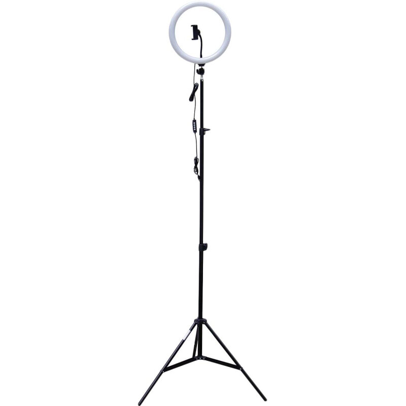 | Комплектация | Кольцевая светодиодная лампа; Шнур питания с пультом и USB-разъёмом; Держатель для смартфона; Гибкое шарнирное крепление (Goose neck); Крепление на стойку (штатив) с интегрированной шаровой головой; Винт регулировки угла наклона лампы; Студийная стойка (до 160 см); Инструкция; Гарантийный талон |