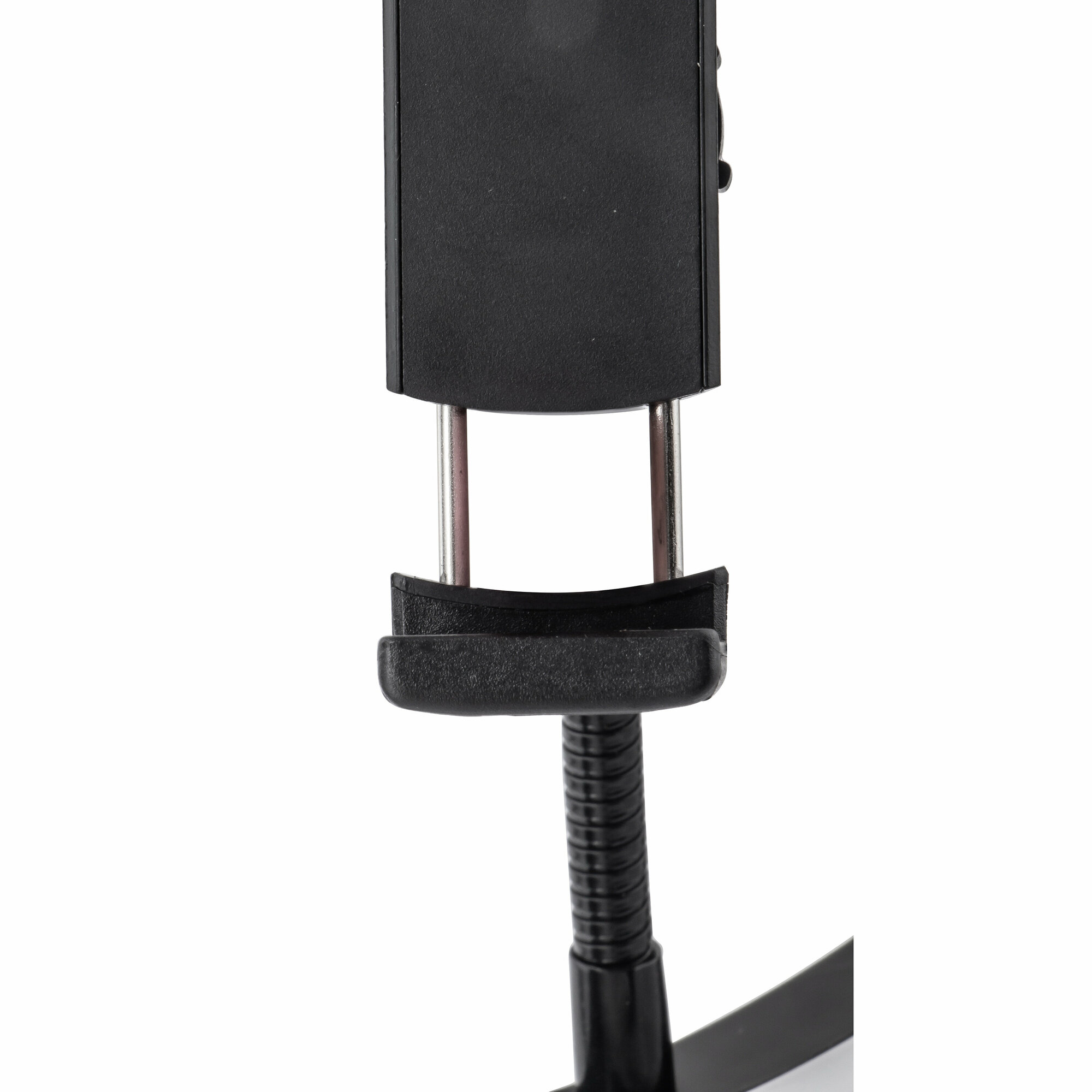 Держатель для смартфона расположен внутри кольца на гибком шарнирном креплении (Goose neck), что дает свободу в выборе ракурса смартфона. Расположение камеры внутри кольца при съёмке минимизирует тени.