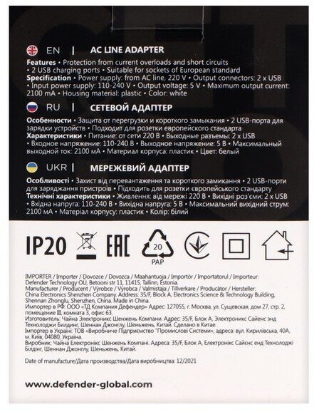 Сетевое зарядное устройство DEFENDER UPA-22 2xUSB 2.1A черный 83579