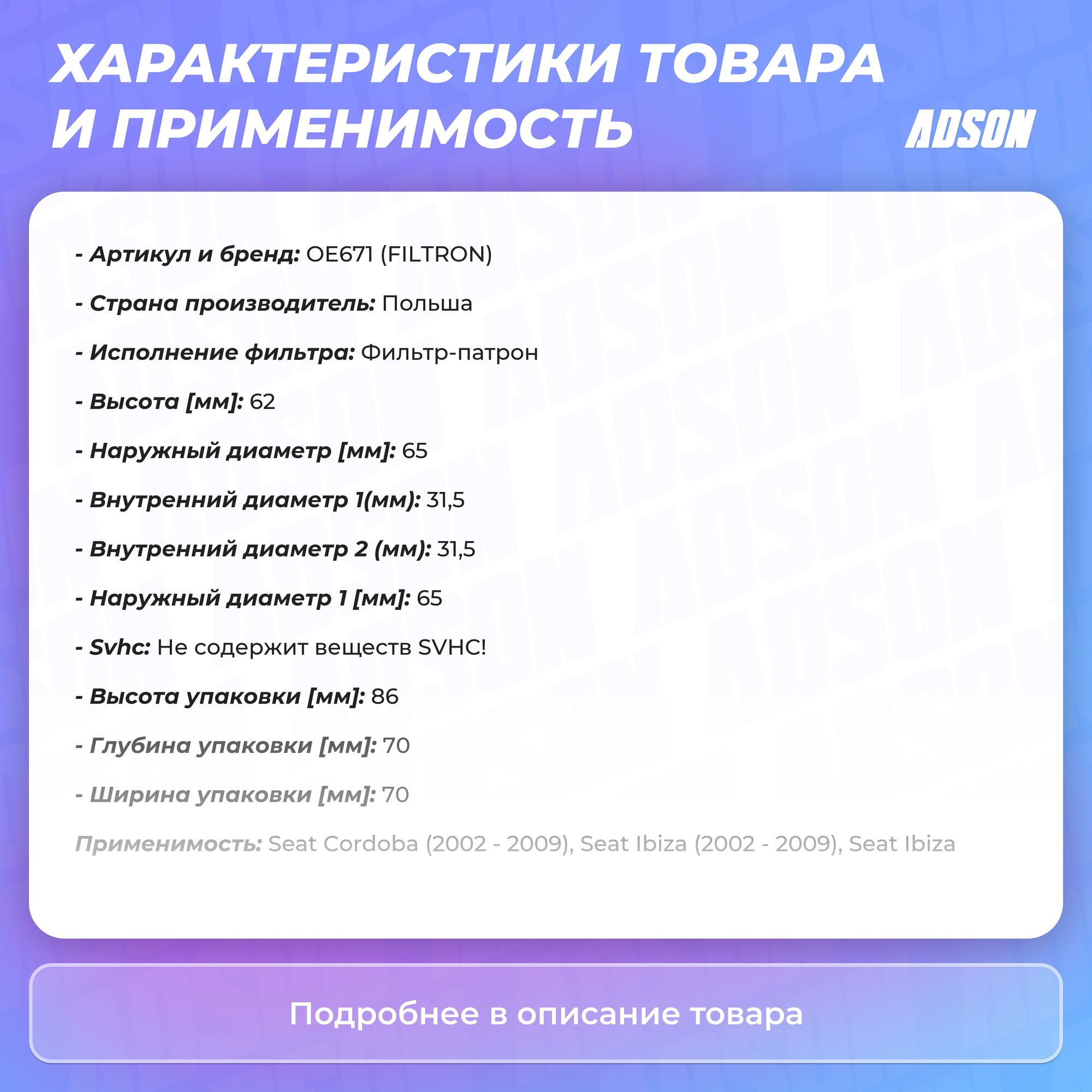 Фильтр масляный Filtron - это высококачественный продукт, разработанный для автомобилей различных марок, включая Ford, Land Rover, Saab, Lotus, Harley-Davidson, Aston Martin, Mercedes-Benz, Suzuki, Jaguar, Volkswagen, SEAT, Skoda и многих других.Фильтр масляный Filtron имеет размеры 62.0 мм в высоту, 65.0 мм в длину и 65.0 мм в ширину, что позволяет легко установить его в большинстве автомобилей. Вес фильтра составляет всего 0.916 кг, что делает его легким и удобным в использовании.Фильтр масляный Filtron является пылевым фильтром, что означает, что он эффективно удаляет частицы пыли и грязи из моторного масла, обеспечивая оптимальную работу двигателя.В целом, фильтр масляный Filtron - это надежный и эффективный выбор для тех, кто ищет высококачественный масляный фильтр для своего автомобиля.