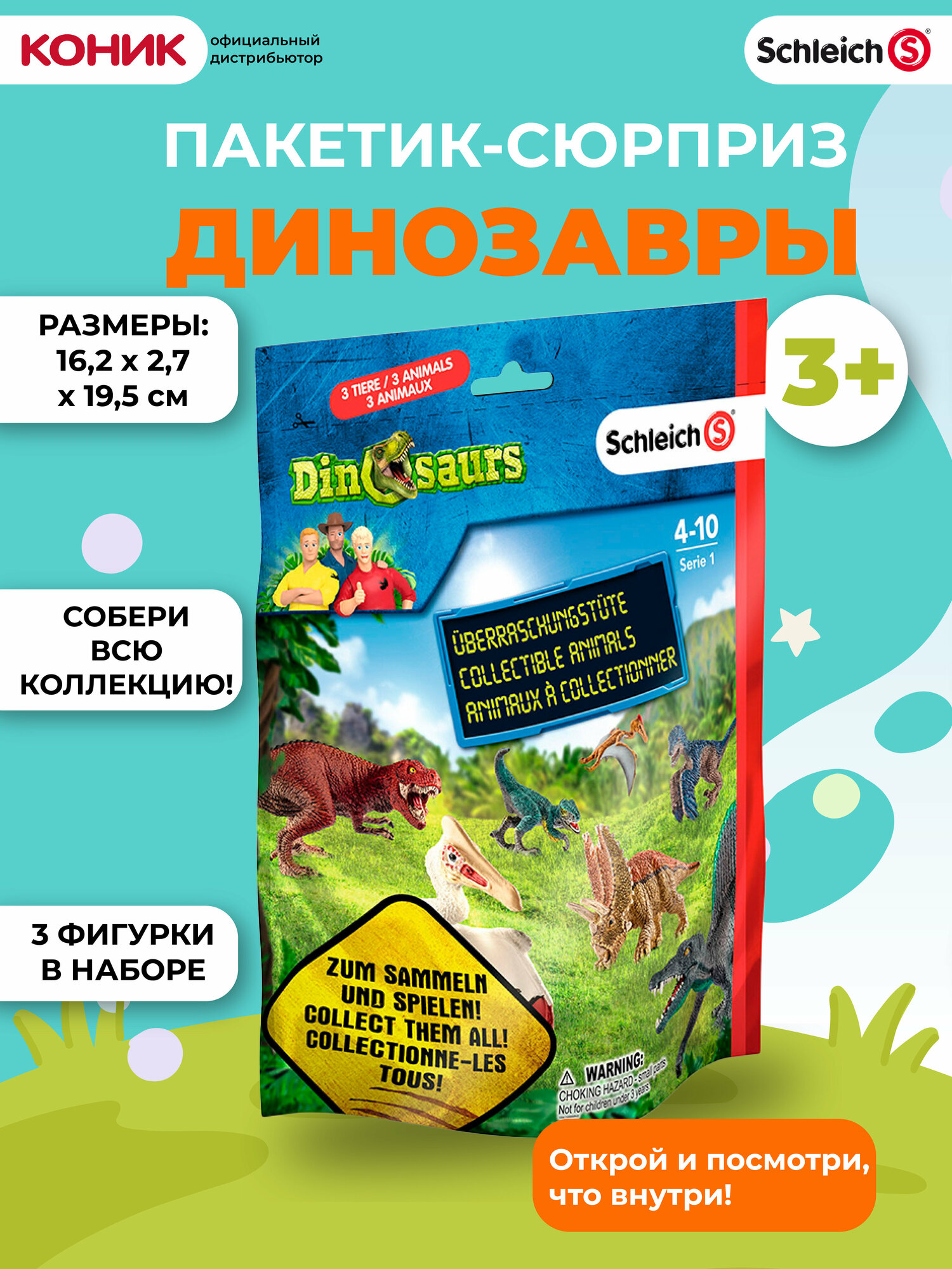 Пакетик-сюрприз — это отличный способ начать знакомство с миром Schleich и собрать свою собственную коллекцию животных или добавить новых персонажей к уже существующим. В данном пакетике спрятано 3 животных из линейки «Динозавры». На обороте каждой упаковки изображены все фигурки, которые можно собрать, вскрывая пакетики.