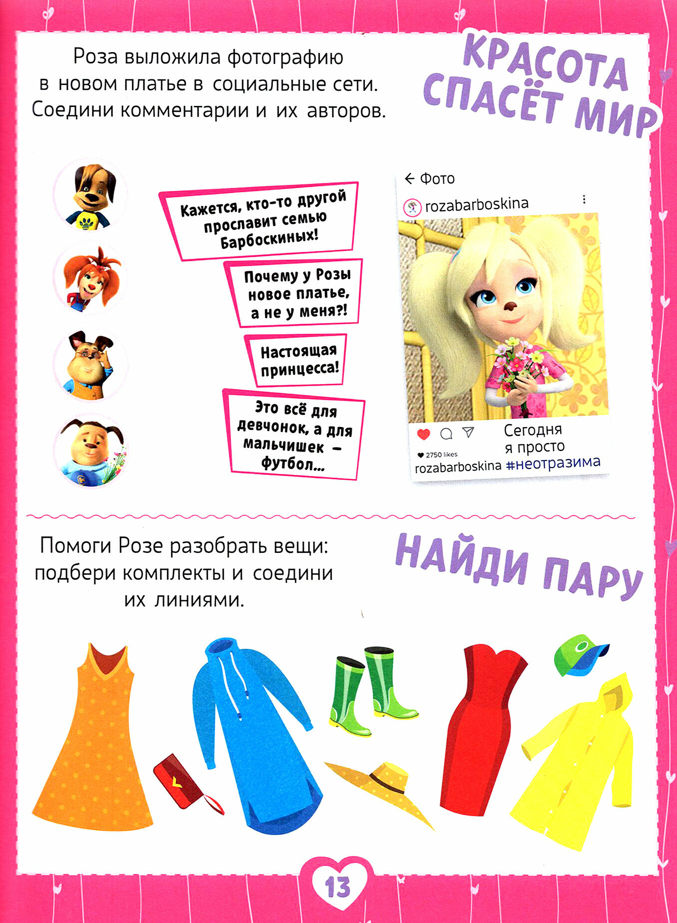 Роза Барбоскина любит модно одеваться и делать макияж, хочет стать артисткой! Есть ли у тебя схожие мечты? Тогда заполни хобби-тетрадь вместе с героиней и узнай ещё больше об увлечениях Розы и других Барбоскиных. Эта хобби-тетрадь поможет тебе погрузиться в мир красоты и творчества. Ты узнаешь о модных столицах, стилях в одежде, кто придумал туфли, и даже попробуешь себя в роли дизайнера одежды – подберёшь наряды героям любимого мультсериала.