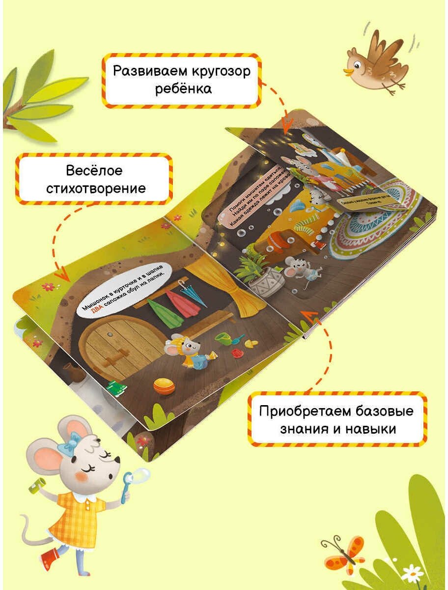 Весёлые герои познакомят малыша с цифрами от одного до пяти. Под большими окошками, которые удобно открывать и закрыать, прячутся интересные задания. Забавные стихотворения помогут запомнить базовый счёт.