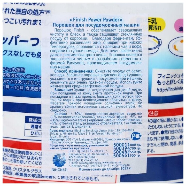 Экологически чистый порошок для посудомоечных машин разработан совместно с производителем посудомоечных машин фирмой Panasonic. Благодаря ферментам и полимерам порошок отлично справляется с жиром и засохшей пищей, с налетом чая и кофе, следами от губной помады. Порошок отличается прекрасной моющей способностью, отмывая посуду быстрее на 30%, чем обычные порошки: Вы экономите время, электроэнергию и воду. Не содержит фосфатов.Способ применения: очистите посуду от остатков еды. Засыпьте порошок в диспенсер - рекомендуемая доза для среднезагрязненной посуды 20 г. Используйте вместе с солью для посудомоечной машины и ополаскивателем.