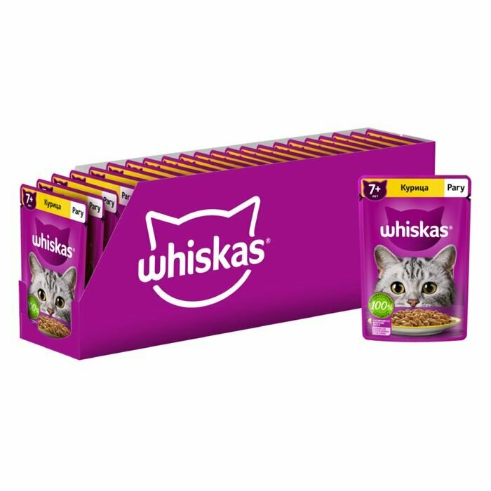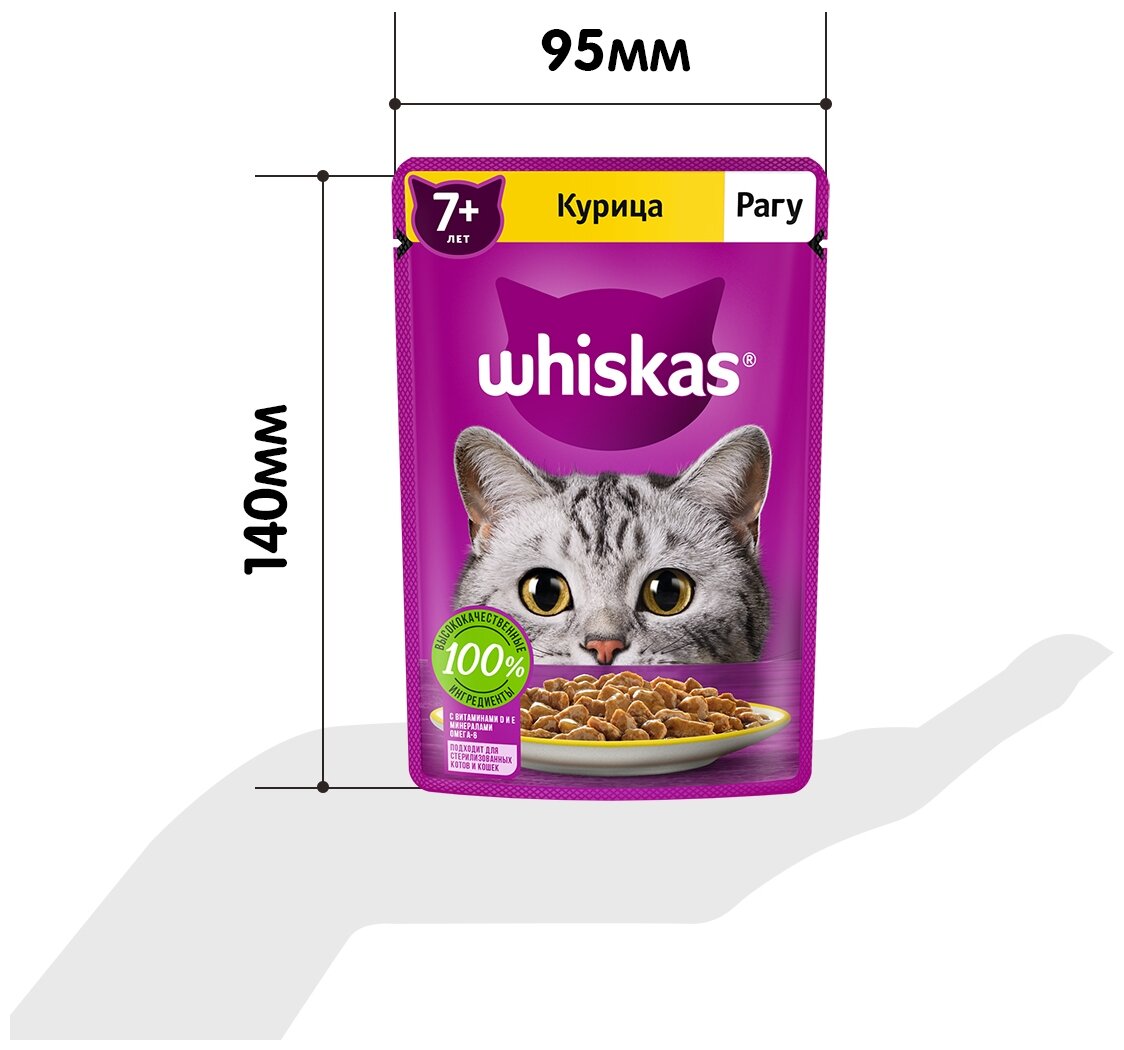 Это сбалансированный рацион, приготовленный с учетом всех потребностей, свойственных возрасту вашей любимицы, для ее долгой, здоровой замурррчательной жизни. Аппетитное рагу с курицей в густом ароматном соусе подарит вашей кошке настоящее удовольствие, поддержит иммунитет, здоровье суставов и мочевыводящей системы.При этом корм Whiskas® содержит все необходимое и полностью отвечает всем потребностям организма вашей любимицы: • 100% натуральные высококачественные ингредиенты: мясо и субпродукты – без добавления ароматизаторов, искуственных красителей и консервантов. • Оптимальный баланс белков и жиров для жизненной энергии • Витамин Е для поддержания иммунитета • Высокоусваиваемые ингредиенты для здорового пищеварения • Источник глюкозамина для здоровья суставов • Жирные кислоты Омега-6 и цинк для здоровья кожи и шерсти • Специальная формула для хорошего аппетита • Витамин D и минералы Подходит для стерилизованных котов и кошек. Ваша кошка будет мурчать от удовольствия!
