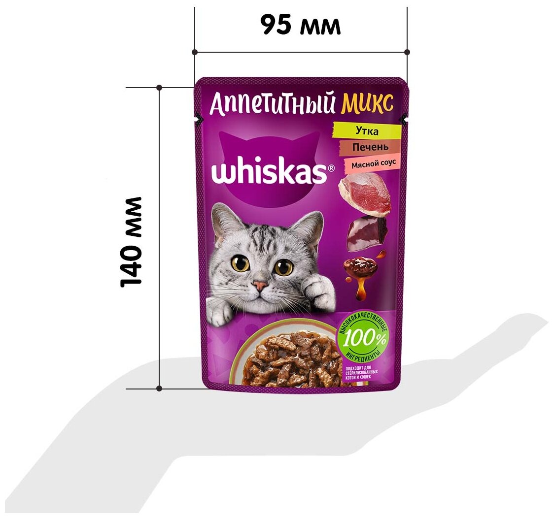 Утка, печень и мясной соус — сразу всё, о чём мечтала ваша кошка, в новой коллекции сбалансированных блюд WHISKAS® Аппетитный микс для замурррчательной жизни. В каждом из паучей содержится три основных ингредиента: разные виды мяса или морепродуктов смешиваются в нежнейшем соусе или желе, чтобы вы воплощали мечты своих любимцев. Подходит для стерилизованных котов и кошек. WHISKAS® для взрослых кошек это: • Оптимальный баланс питательных веществ для полноценной жизни. 100% сбалансированный рацион • Всё необходимое для поддержания здоровья: Омега-6, кальций, фосфор и таурин, витамин Е, цинк. • Вкусное питание с высоким содержанием белка на каждый день. • 100% натуральные высококачественные ингредиенты: мясо и субпродукты – без добавления ароматизаторов и консервантов. Ваша кошка будет мурчать от удовольствия! Рекомендации по кормлению WHISKAS® рекомендует сочетать разные форматы корма в рационе вашей кошки. Утром и вечером вашей любимице нужно давать влажный рацион, а в течение дня — сухой. Такой тип питания позволит объединить преимущества каждого из форматов. Преимущества сухих рационов: • Профилактика заболеваний ротовой полости • Профилактика заболеваний желудочно-кишечного тракта Преимущества влажных рационов: • Профилактика ожирения • Профилактика заболеваний мочевыводящей системы Нужно помнить, что смешивать в одной миске сухой и влажный рационы не рекомендуется. Кроме того, у вашей любимицы всегда должен быть доступ к чистой питьевой воде.