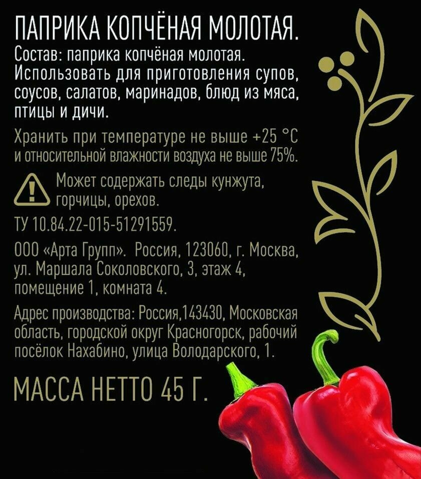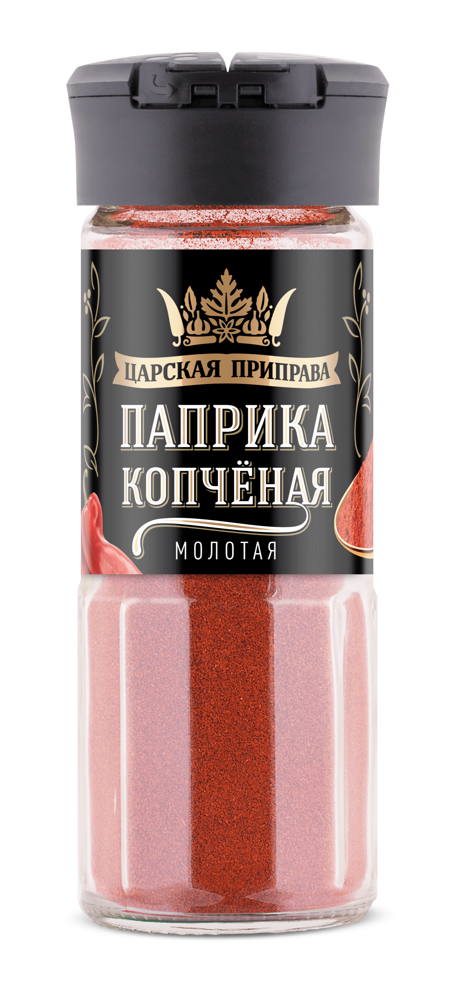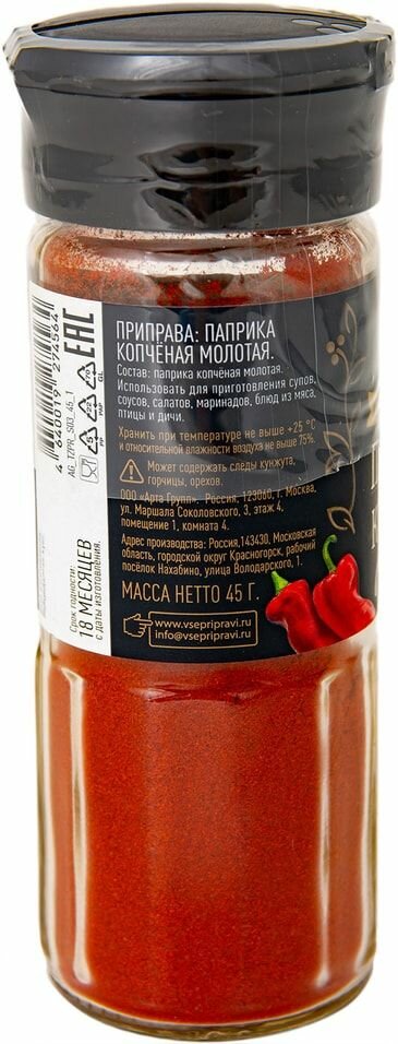 Паприка красная копченая «Царская приправа» родом из Испании. Паприка обладает неповторимым ароматом и дарит блюду очень изысканный и стильный вкус. Производят копченую паприку из обычной спелой паприки. Сначала ее плоды высушивают, после чего коптят. Отлично сочетается с блюдами, приготовленными на гриле, с запеченным картофелем, с рисом и овощами, а также мясными копченостями. Удобная крышка – дозатор.со страницы.