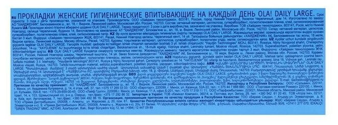 | Полное наименование | Ежедневные прокладки Ola! Daily Large 3 капель 20 шт |