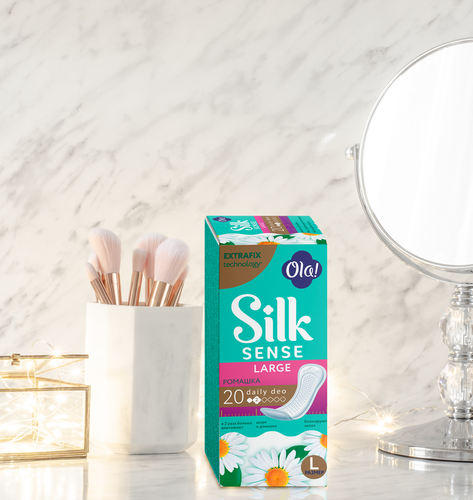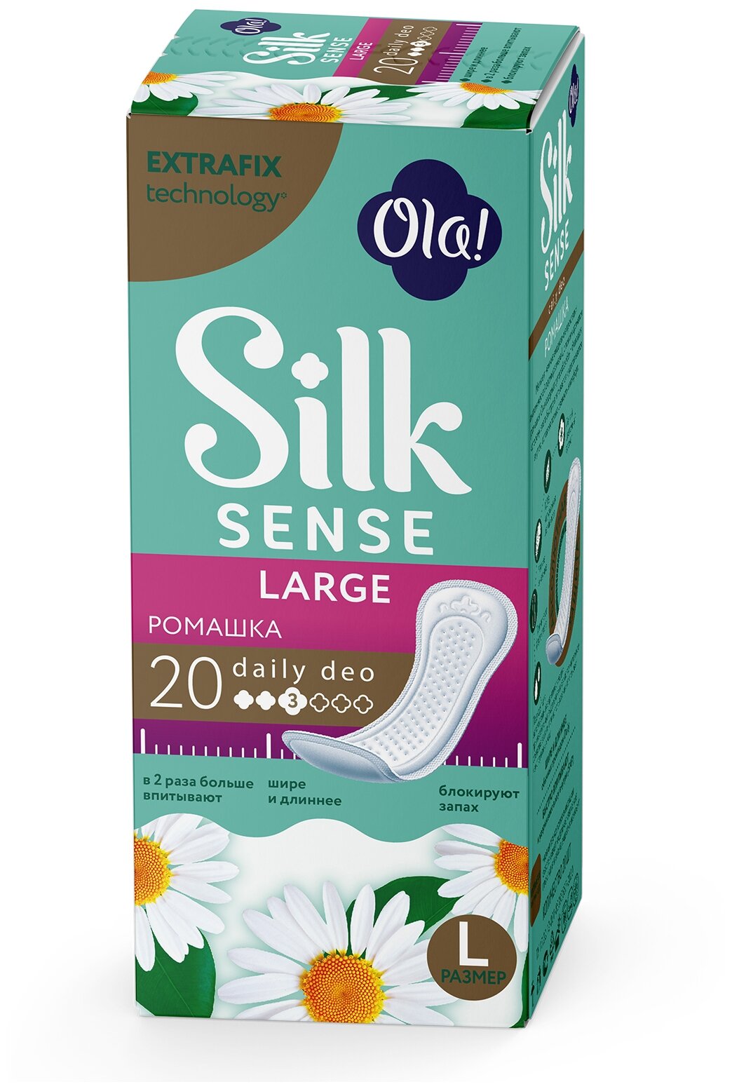 | Полное наименование | Прокладки ежедневные Ola! Silk Sense Daily Deo large ромашка 3 капли 20 шт |