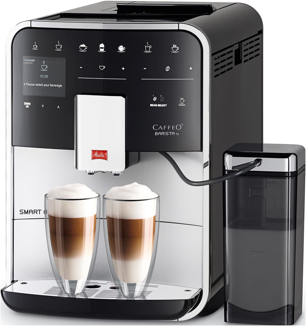 | Дополнительно | сенсорные кнопки управления, 2-камерный контейнер для зерен, возможность управления через мобильное приложение Melitta® Connect, светодиодная подсветка чашек, функция выбора рецептов, функция запоминания собственных рецептов |