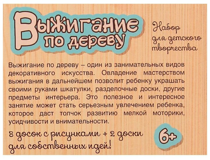 В данном наборе 10 досок, точнее фанерок для выжигания (все-таки под доской для выжигания чаще понимается фанера). Это качественная фанера, рисунки на которой выполнены специальной немецкой краской, не выделяющей вредных веществ при горении (нагревании). Две доски пустые, а на восьми — достаточно сложные рисунки (с одной стороны).