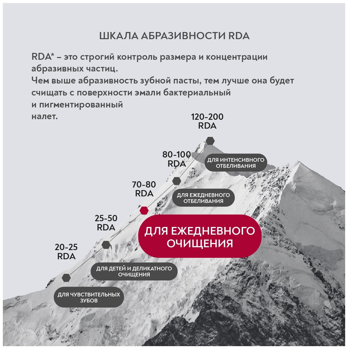 RDA* – это строгий контроль за размером и концентрацией абразивных частиц. Специально подобранные абразивы безопасно и эффективно удаляют налет, очищают и полируют зубную эмаль.
