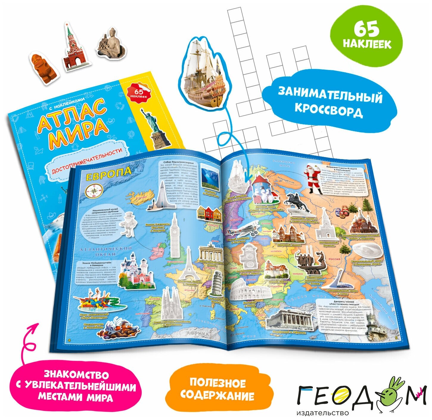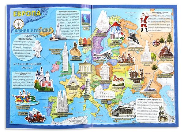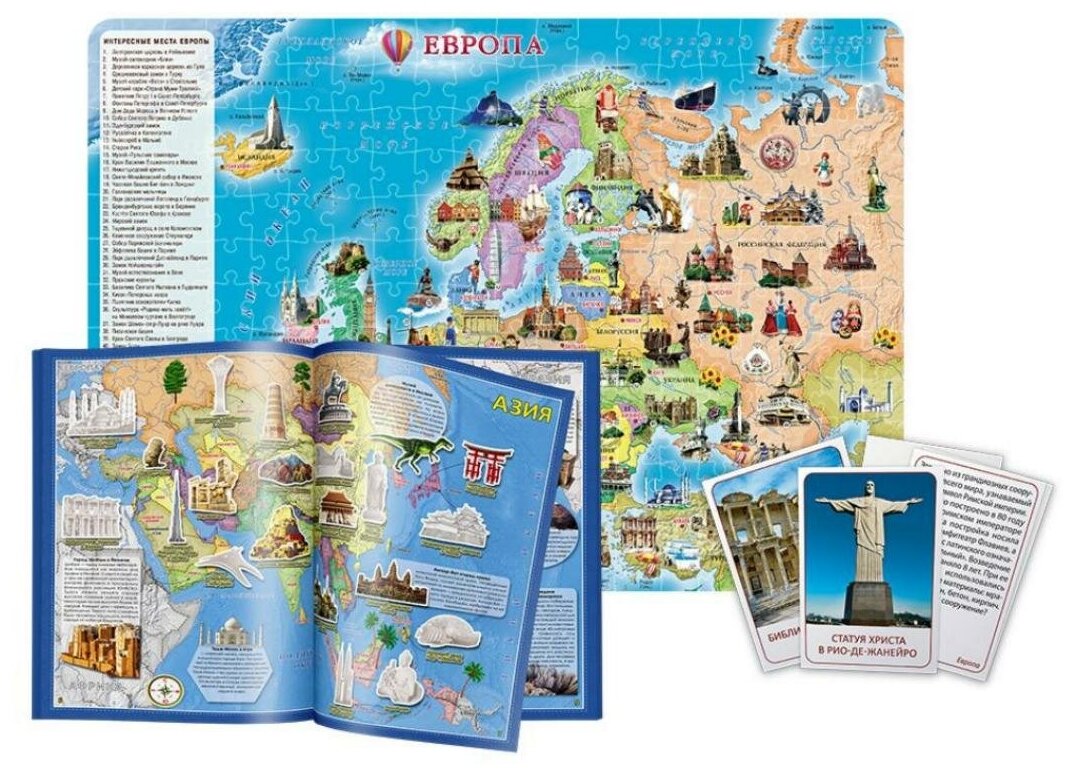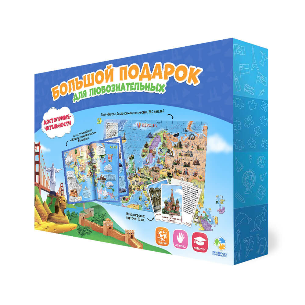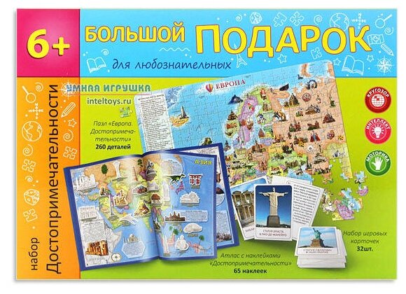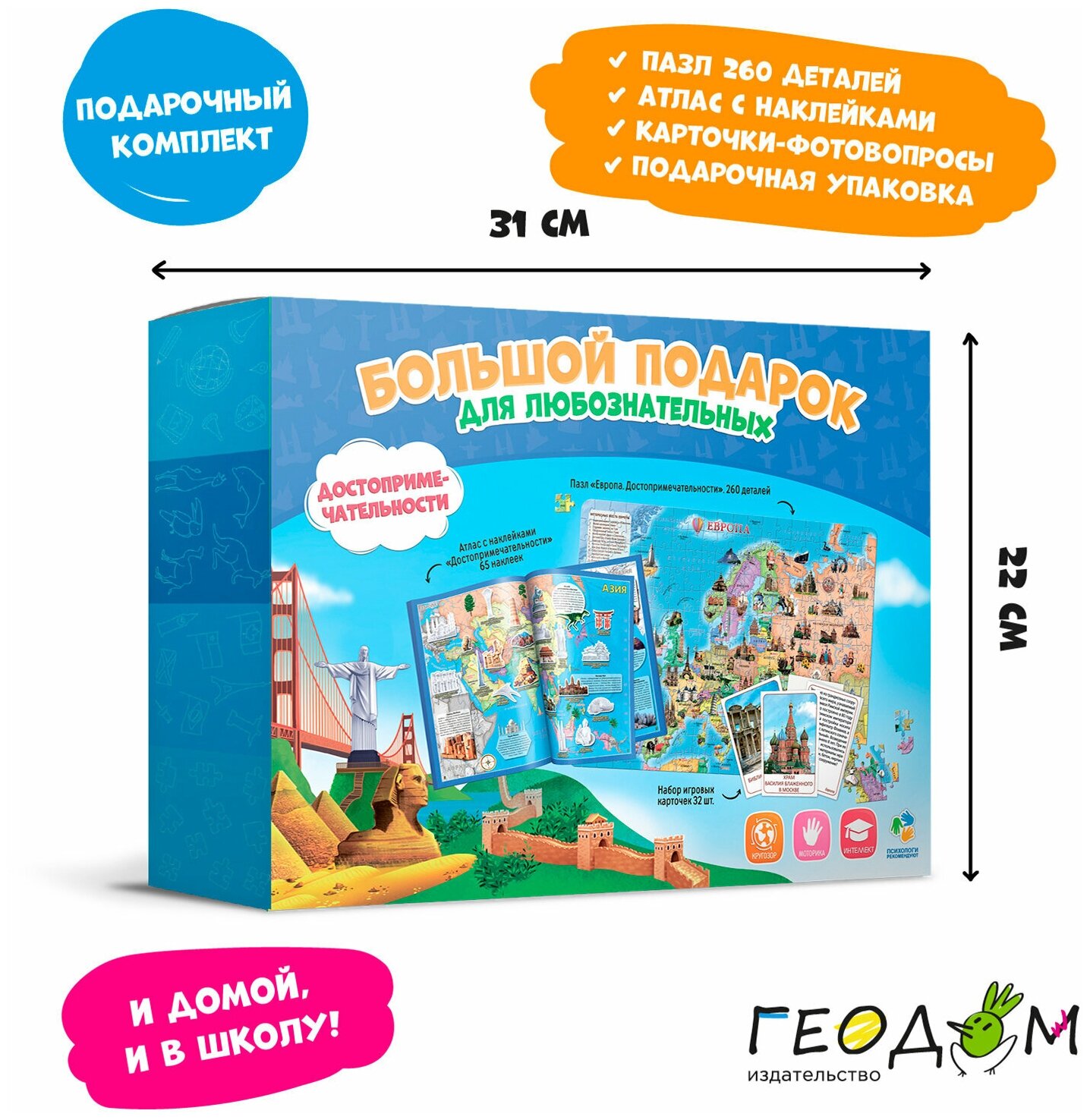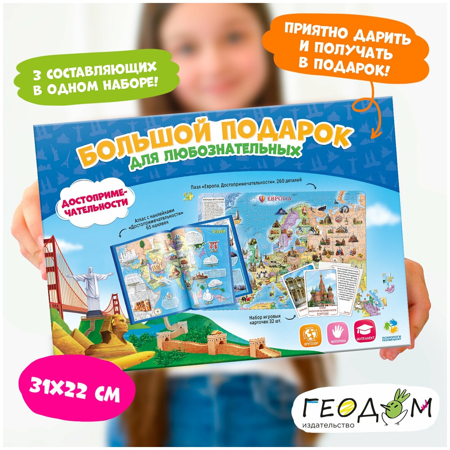 Геодом Большой для любознательных "Достопримечательности" - познакомит детей с достопримечательностями всего мира. Атлас с наклейками расскажет о значимых памятниках истории и аректуры Земли. Собрав пазл из 260 деталей, ребёнок узнает о достопримечательностях Европы. Набор игровых карточек направлен на изучение отличительных характеристик каждого памятника. Этот подарочный набор сделает процесс обучения очень увлекательным.